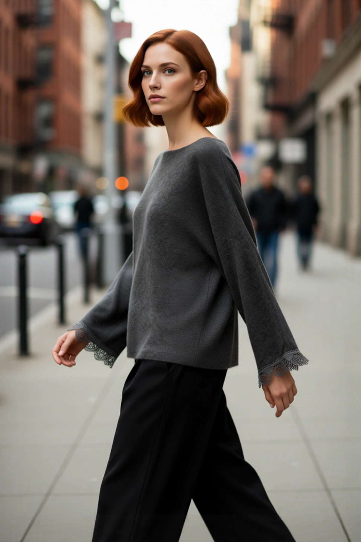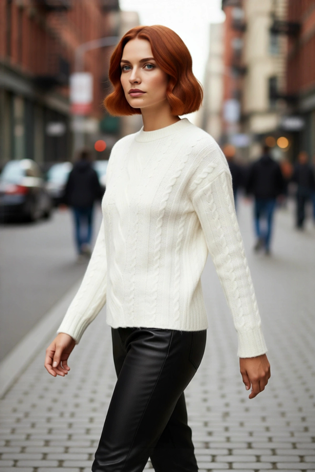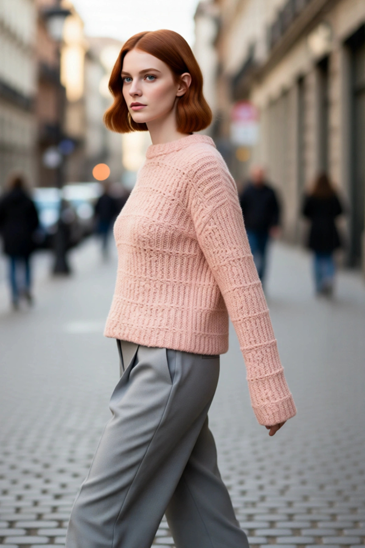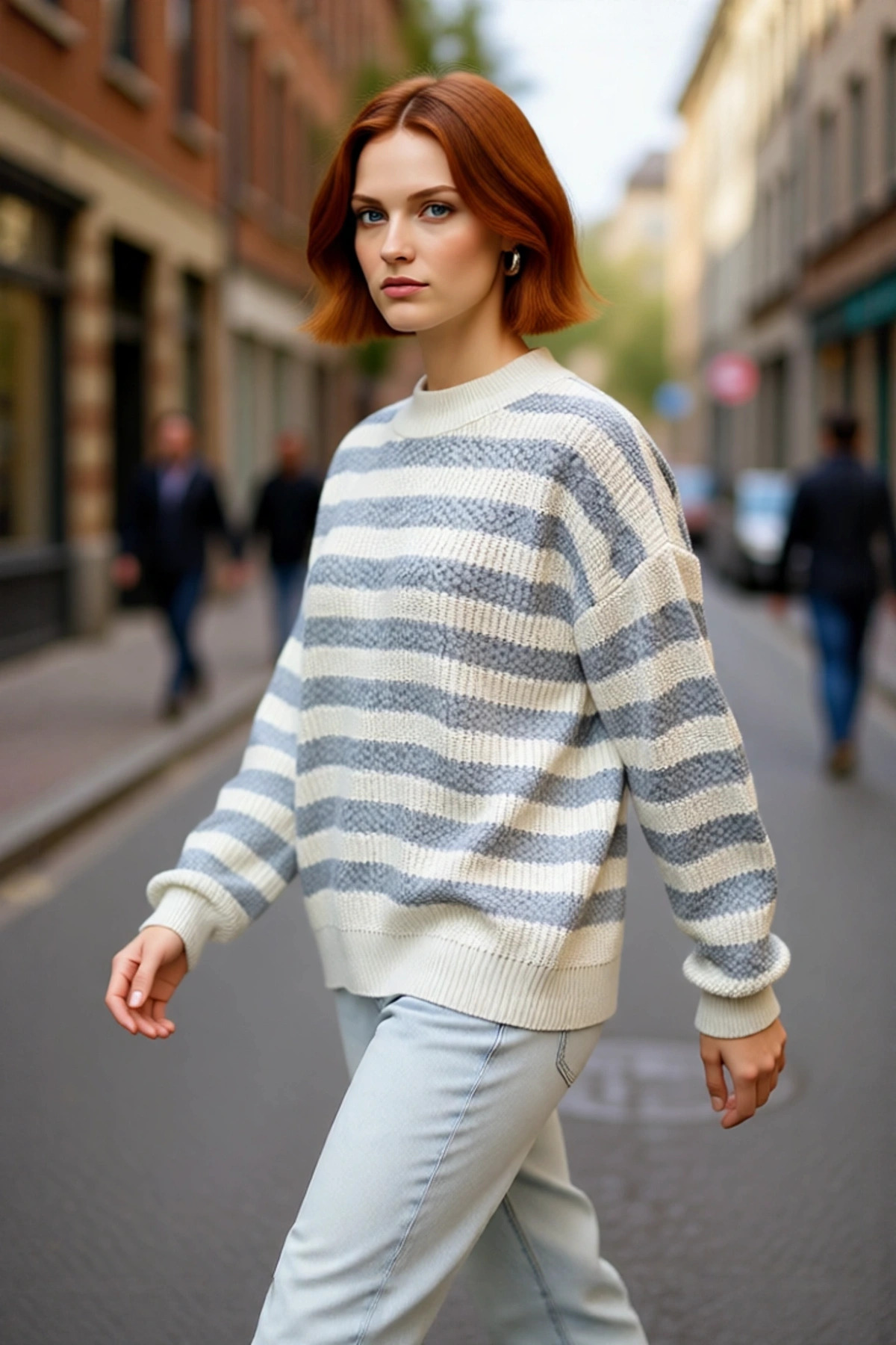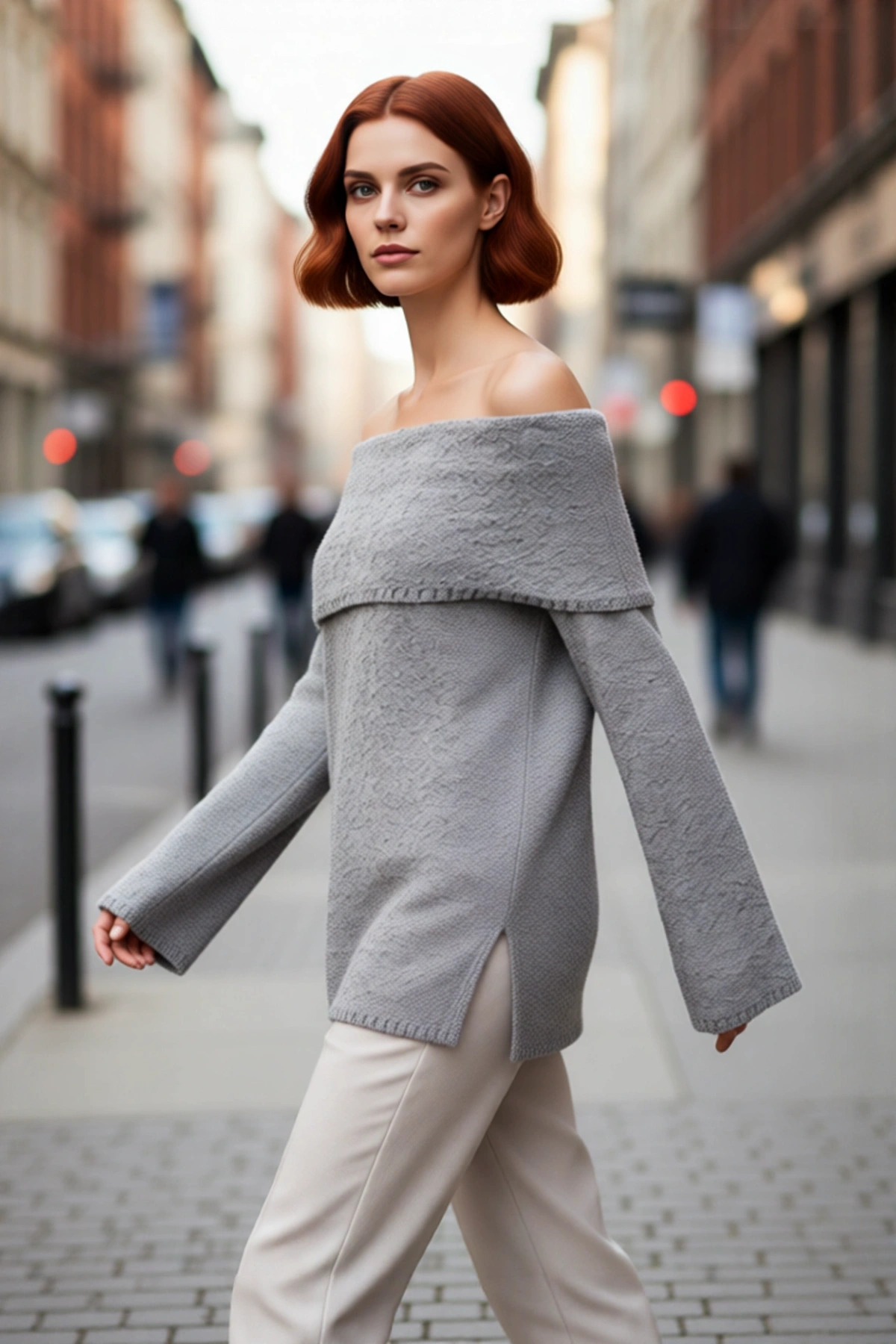 Kadınlara Özel Oversize Kesim Rahat Bisiklet Yaka Desenli Bej Gri Triko Kazak Kış Şıklığı Kaliteli