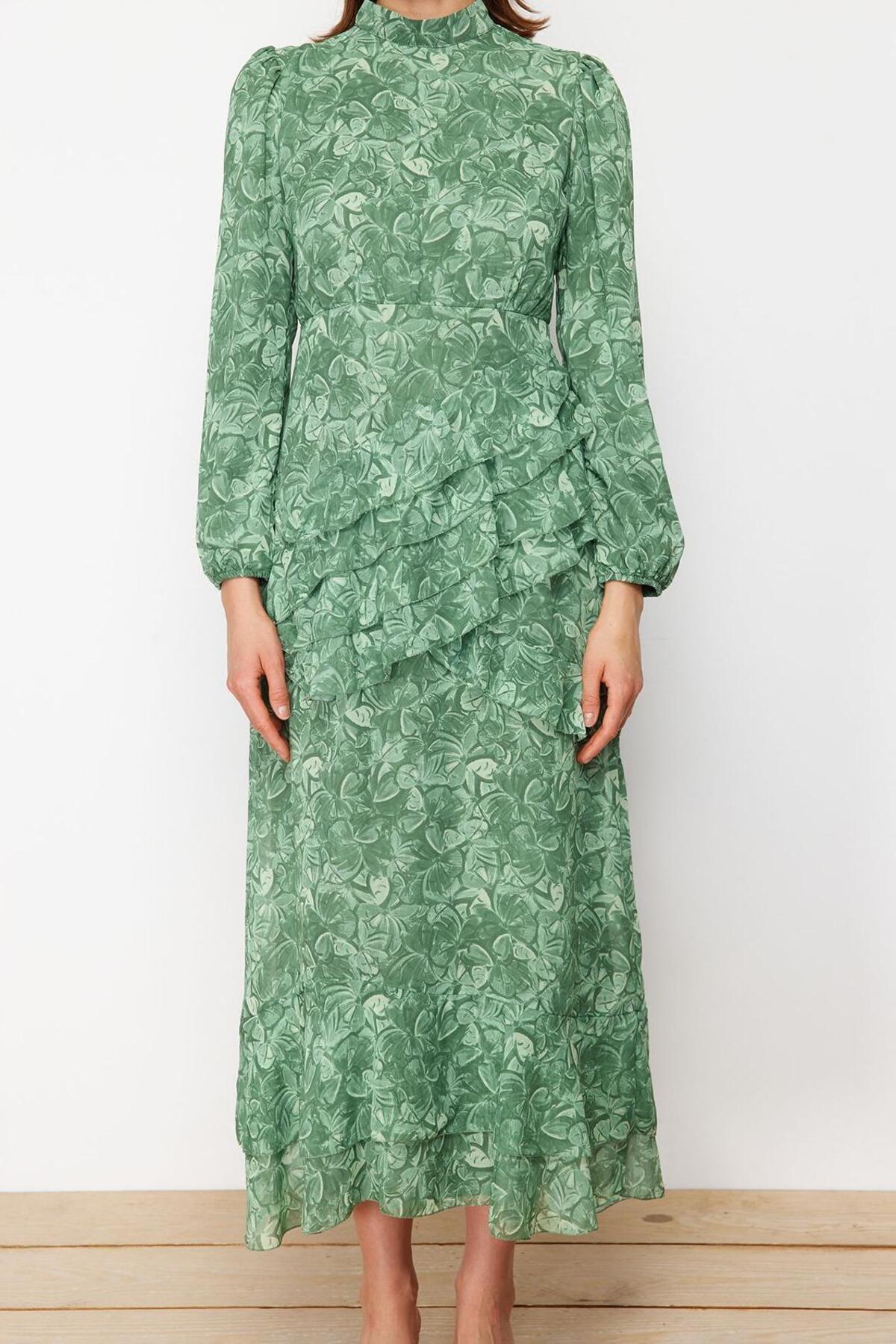 Kadın Astarlı Uzun Kollu Bisiklet Yaka Çiçek Desenli Maxi Eteği Fırfırlı Şifon Elbise Kaliteli