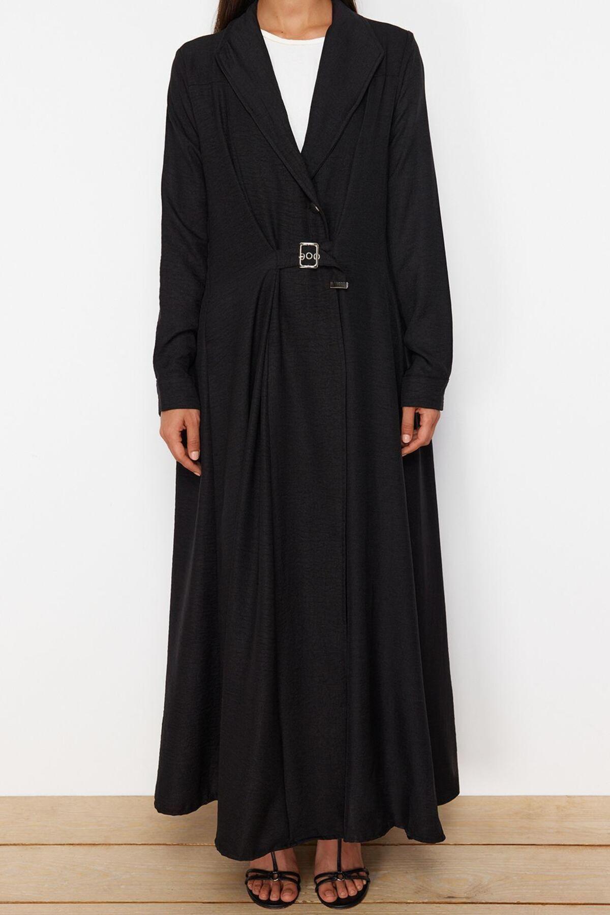 Moda Stil Regular Bisiklet Yaka Maxi Boy Tesettür Kuşaklı Önü Parçalı Pamuklu Dokuma Astarsız Elbise