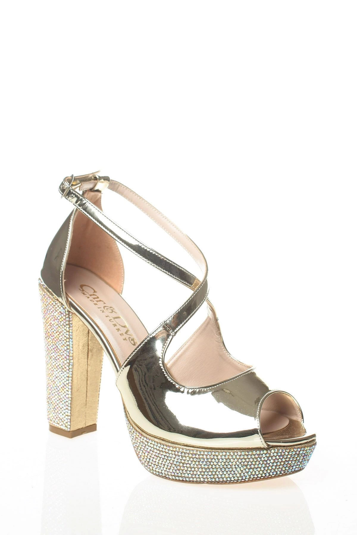 Kadın Gold Ayna Ökçe Poli Taş Abiye Ayakkabı Kadın Topuklu Şık Gece Ayakkabısı Zarif Tasarım