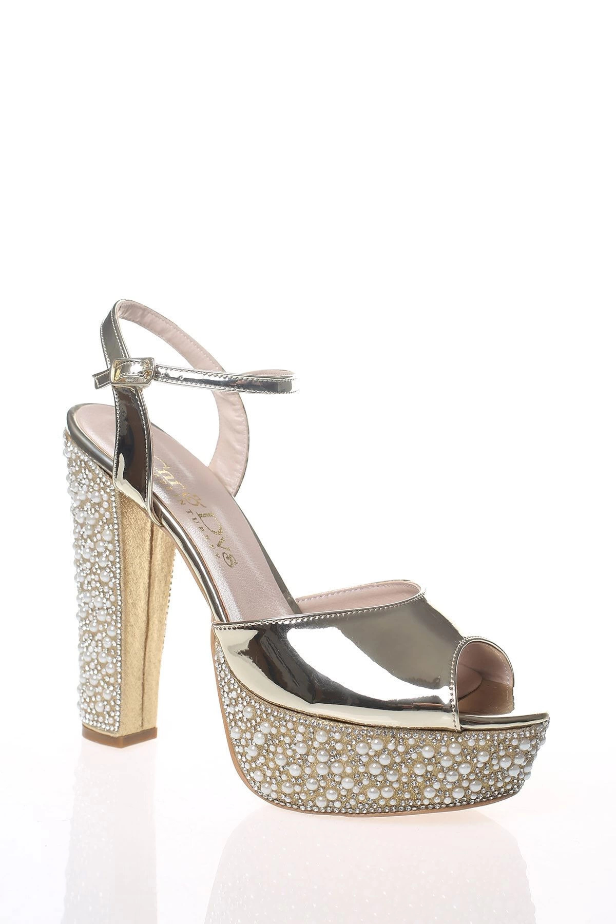 Kadın Altın Ayna Ökçe Poli İnci Abiye Ayakkabı Kadın Topuklu Şık Gece Ayakkabısı Zarif Tasarım