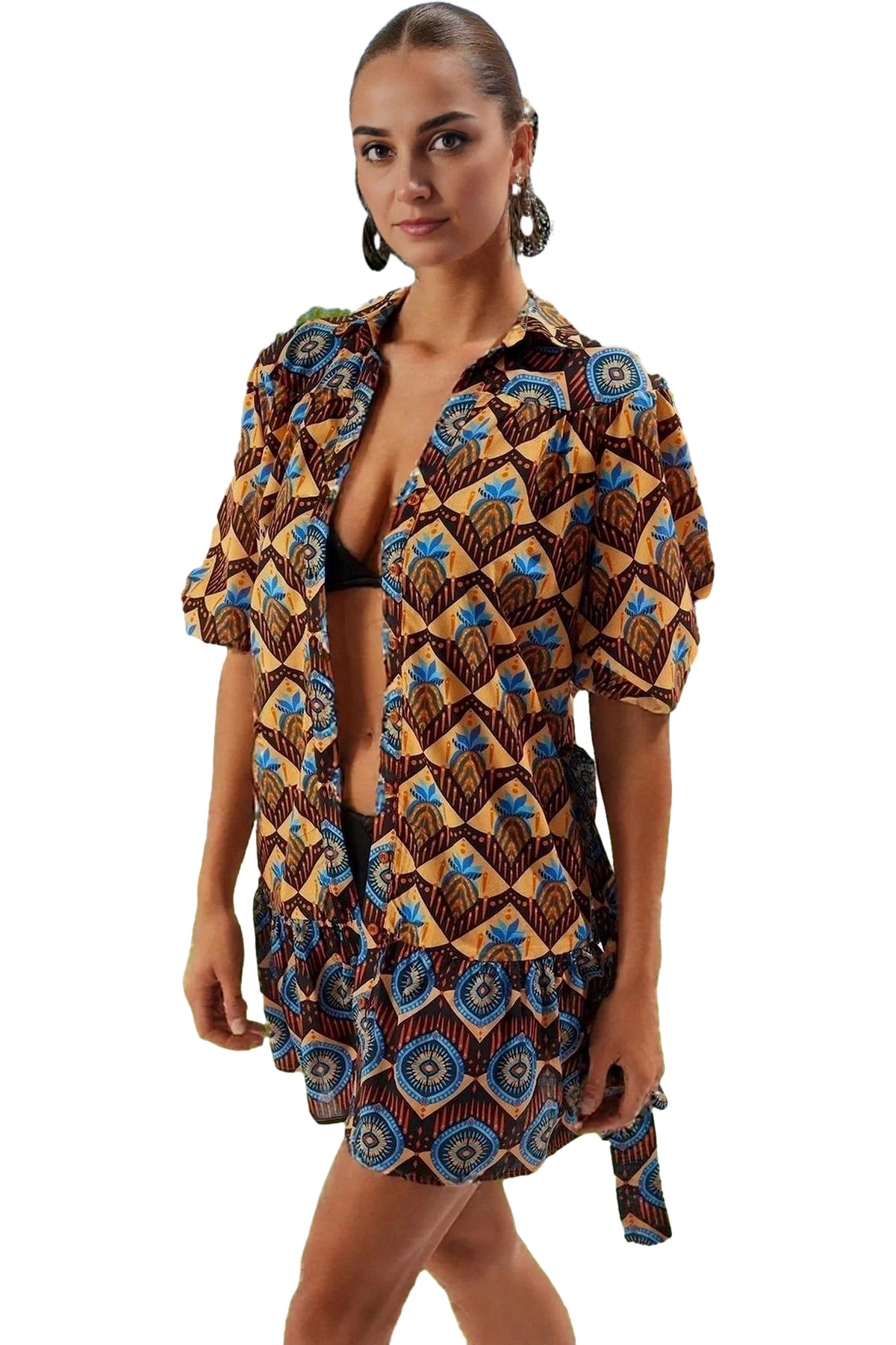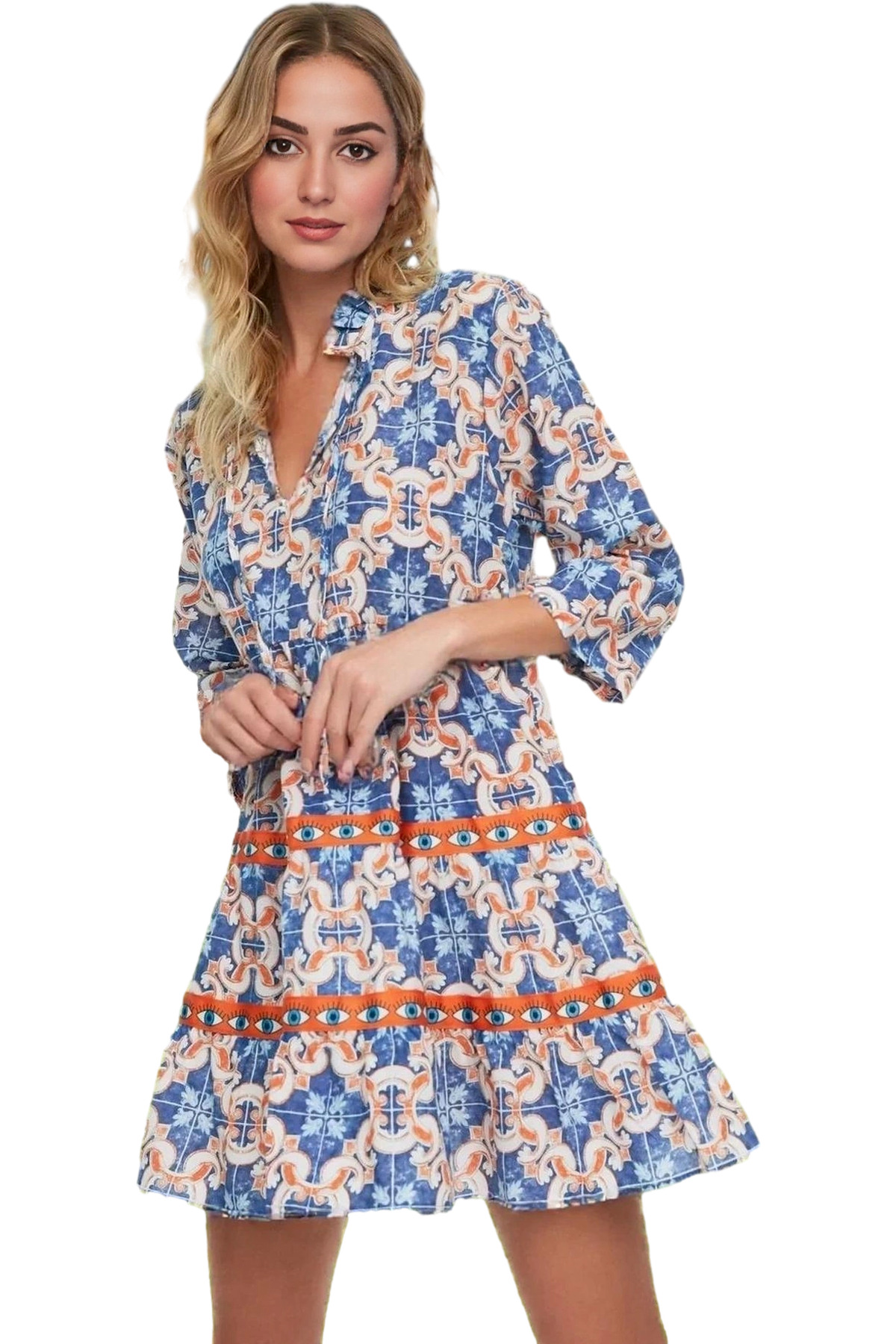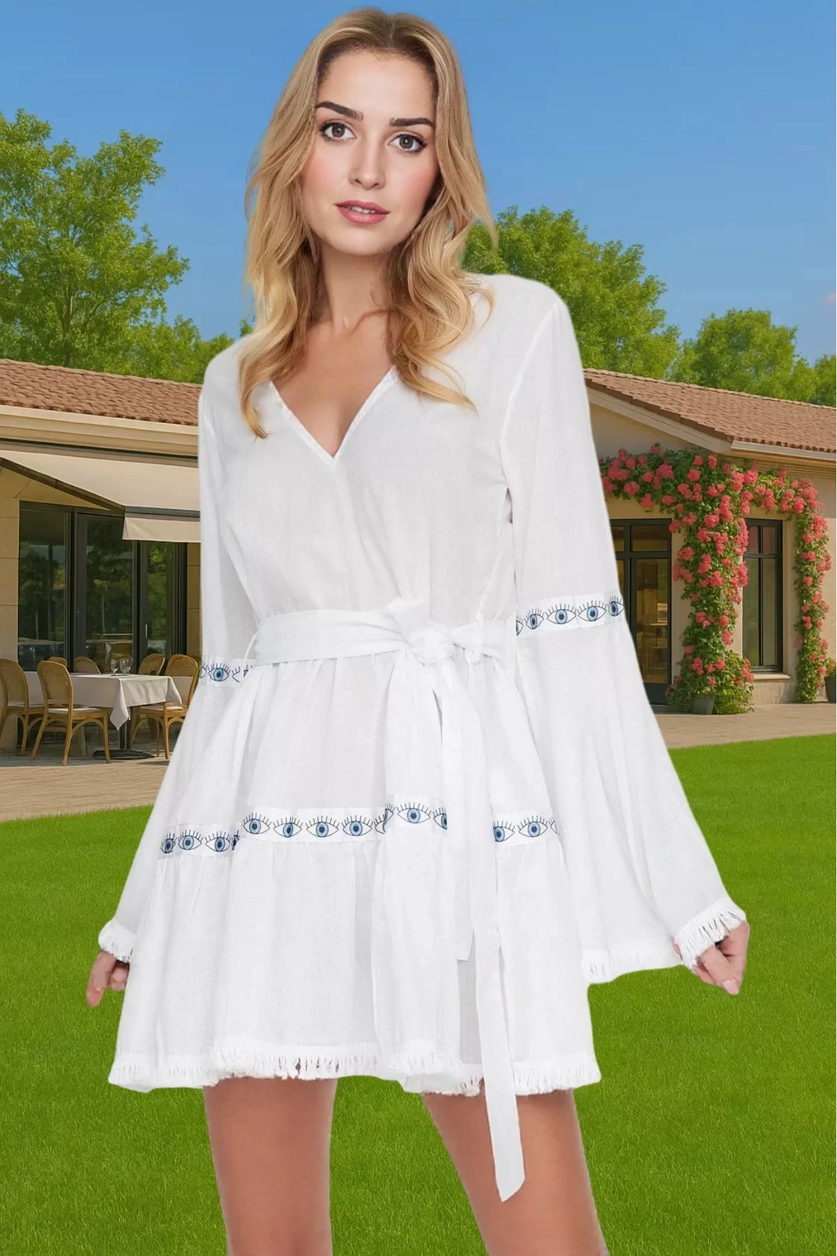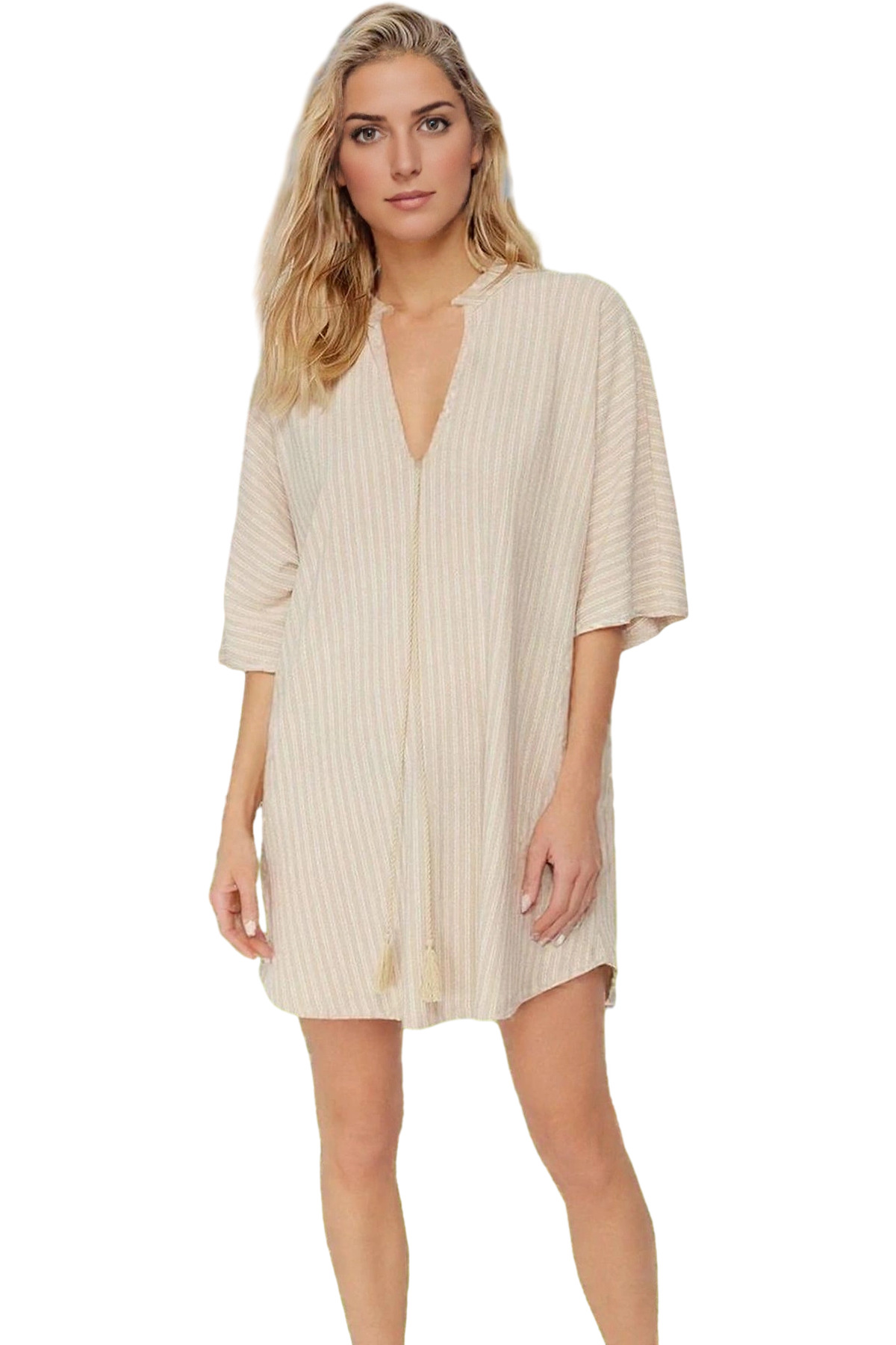 Şık Örme Bağlamalı Mini Plaj Elbisesi Rahat Kalıp Yazlık Kombin Dayanıklı Malzeme Rahat Ve Şık