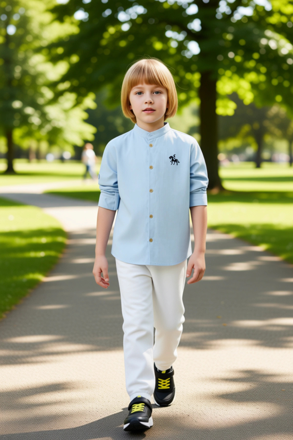 Erkek Çocuk Hakim Yaka Nakışlı Gömlek ve Beli Lastikli Pantolon Seti Kaliteli Şık Rahat