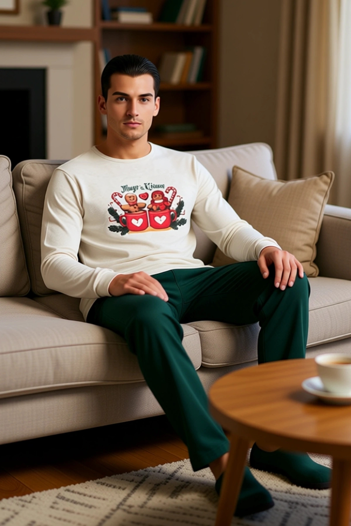 Erkek Yılbaşı Baskılı Pijama Takımı Bisiklet Yaka Uzun Kollu Fonksiyonel Dayanıklı Estetik