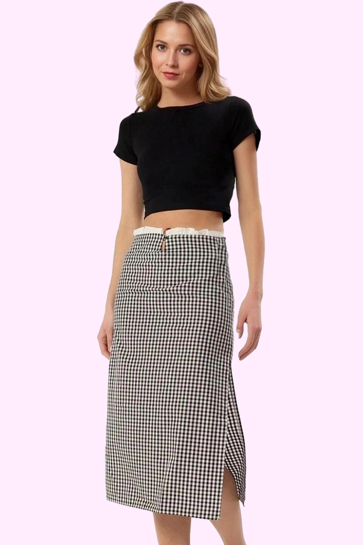 Kadın Ekoseli A line Midi Etek Belden Düğmeli Fırfırlı Yazlık Tasarım Yaz Aylarının Vazgeçilmezi