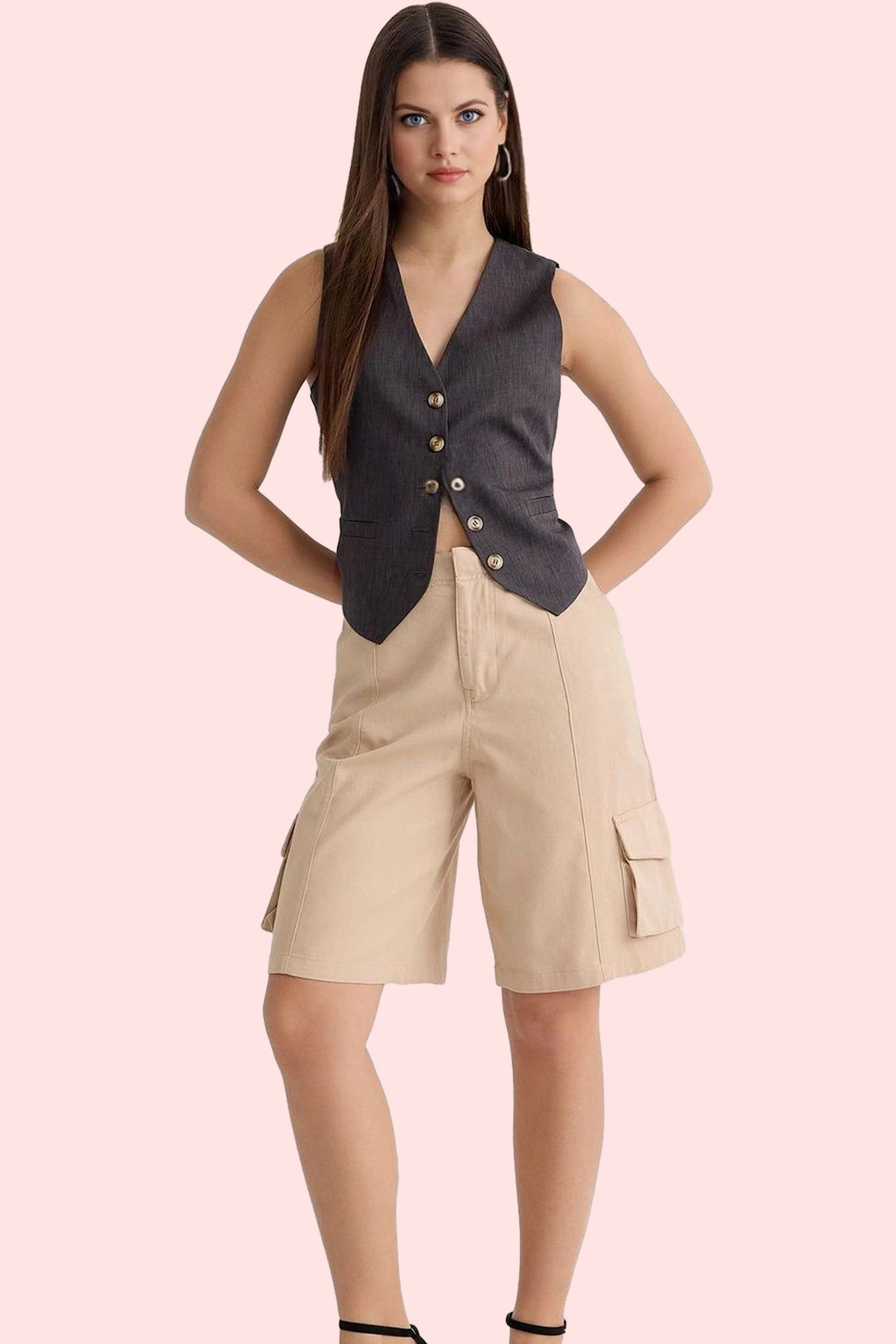 Kadın Cep Detaylı Yüksek Bel Kısa Şort Straight Kalıp Ramadan Koleksiyonu Günlük Kombinler