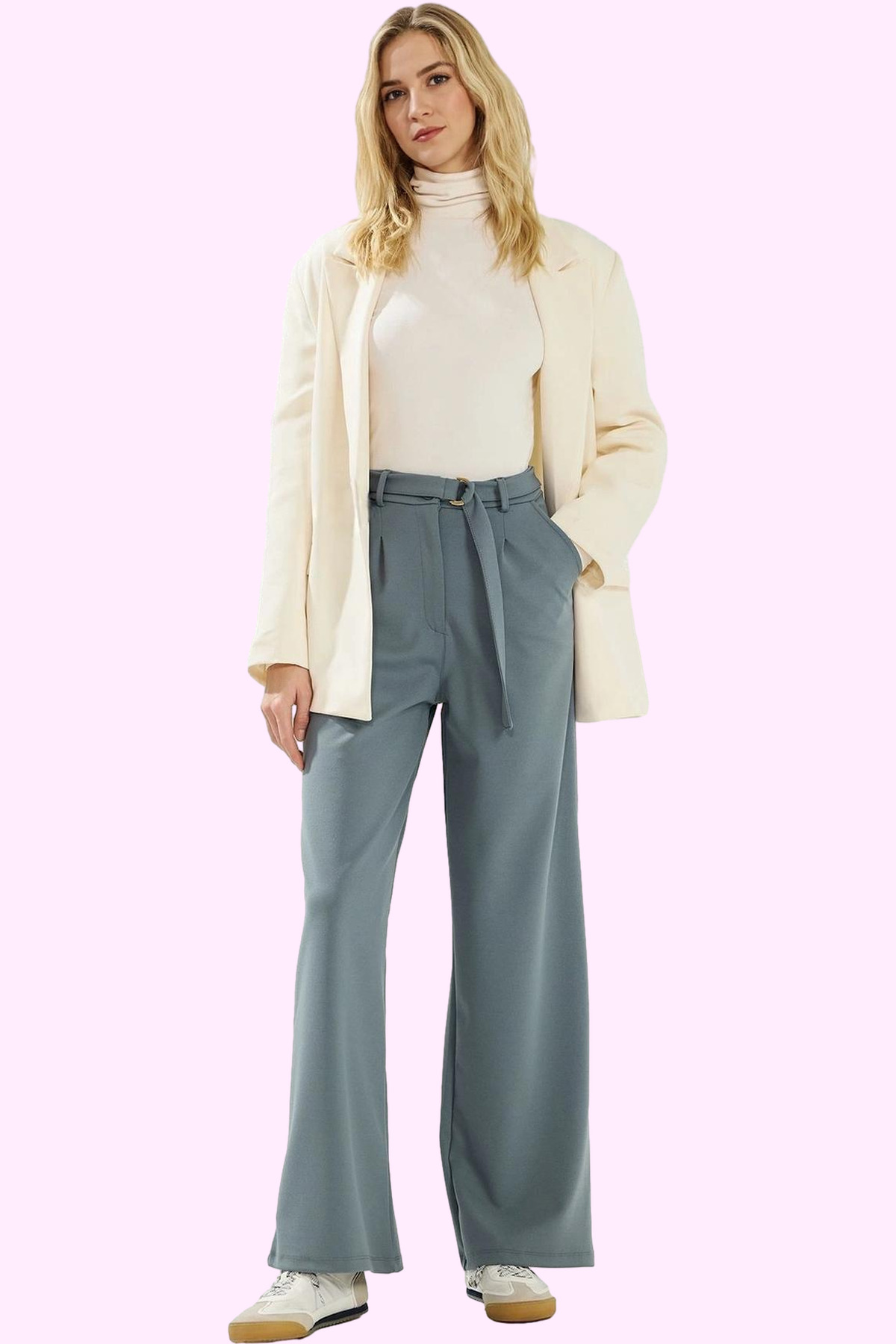 Kadın Yüksek Bel Geniş Paça Kemerli Örme Pantolon Fonksiyonel Dayanıklı Kaliteli Konforlu Şık