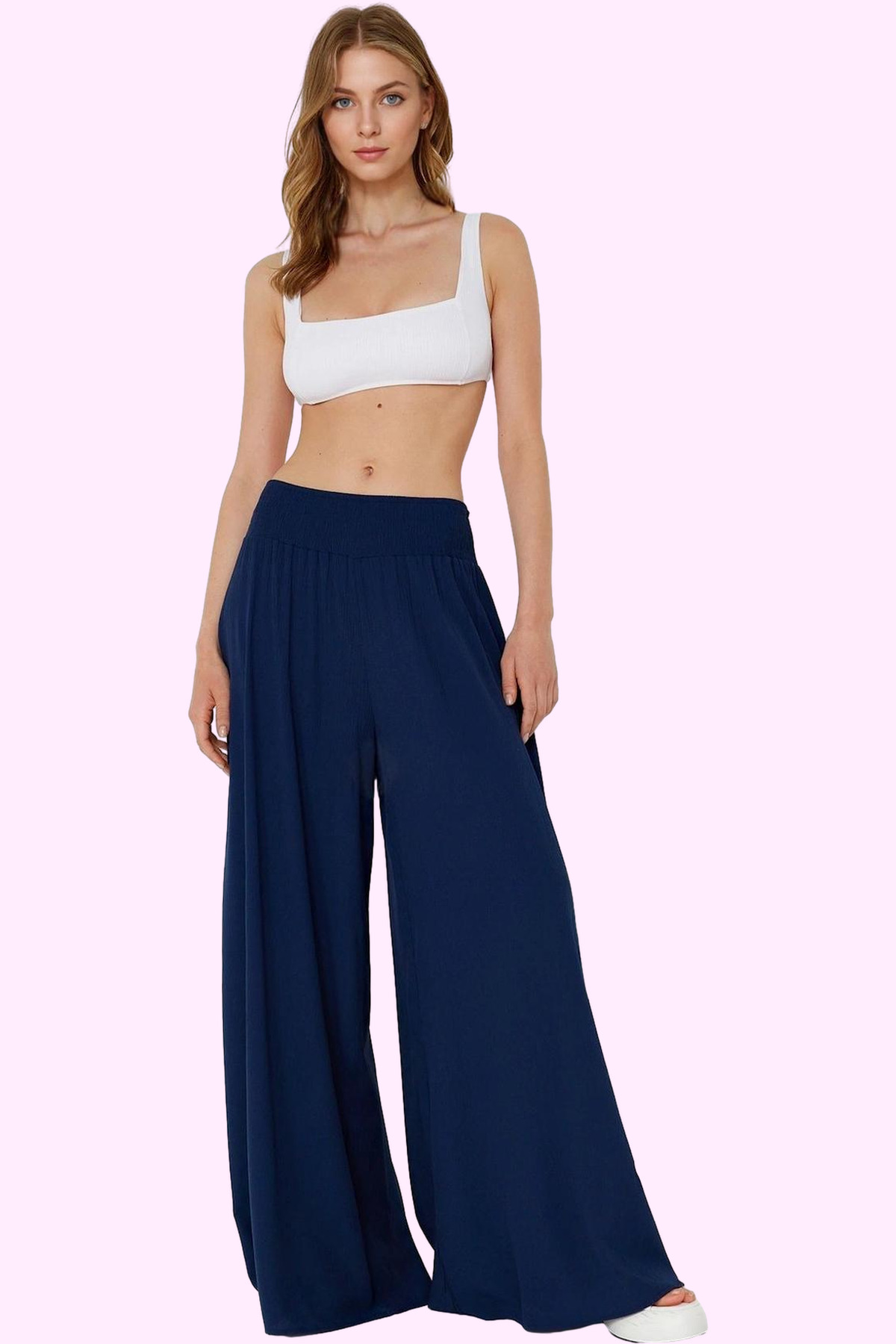 Kadın Crinkle Dokuma Plaj Pantolonu Yüksek Bel Geniş Paça Rahat ve Şık Tasarım Günlük Kullanım