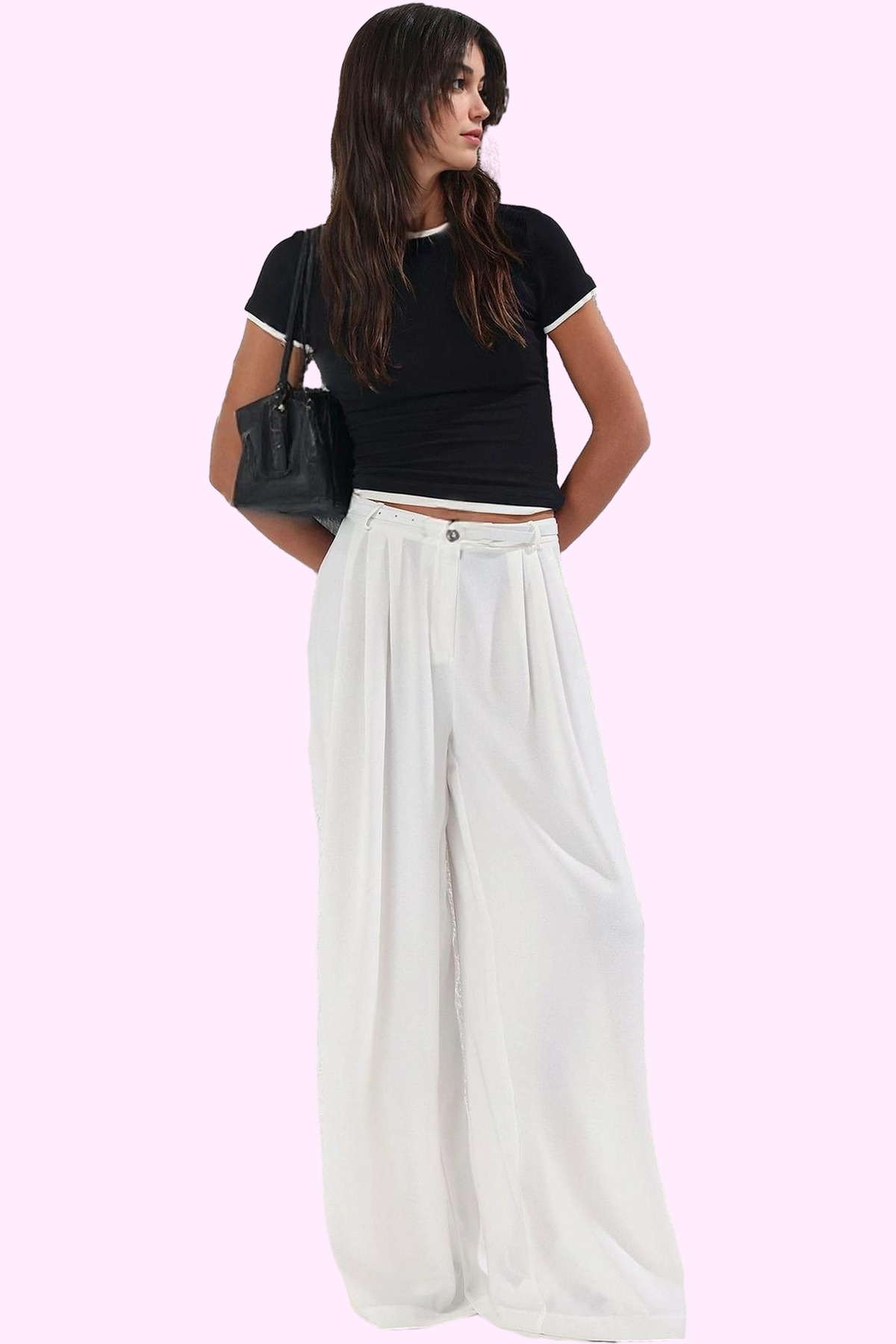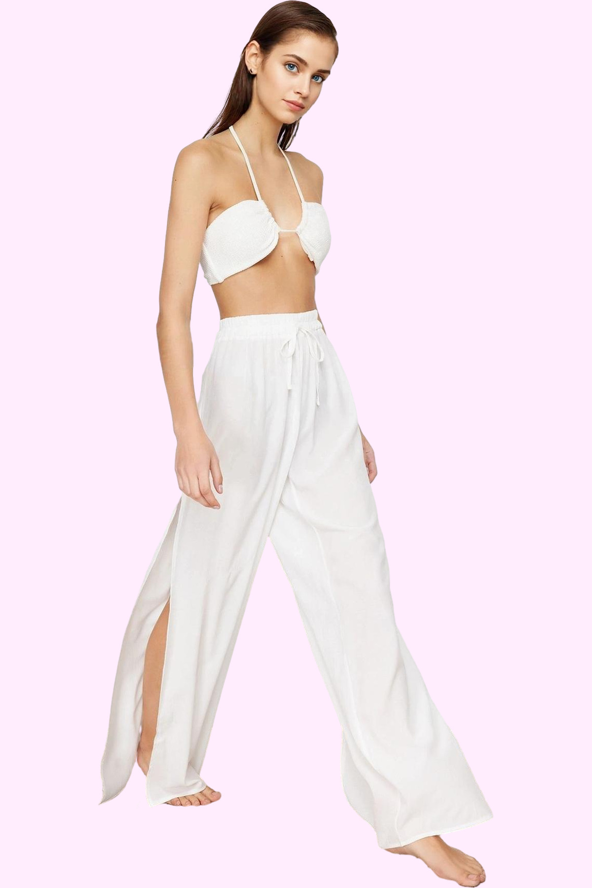 Kadın Pamuklu Plaj Pantolonu; Yüksek Bel Geniş Paça Dokuma Kumaş Yazlık Yaz Aylarının Vazgeçilmezi