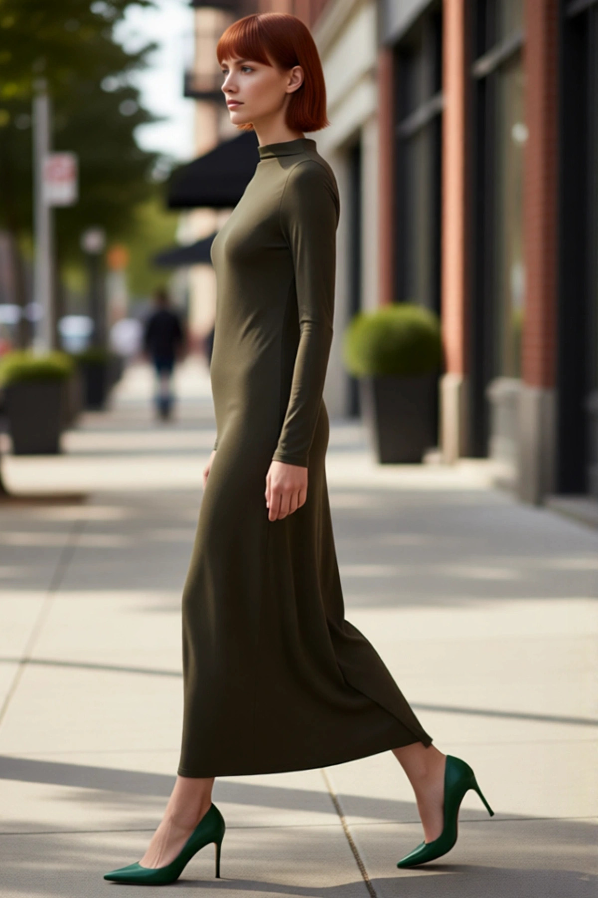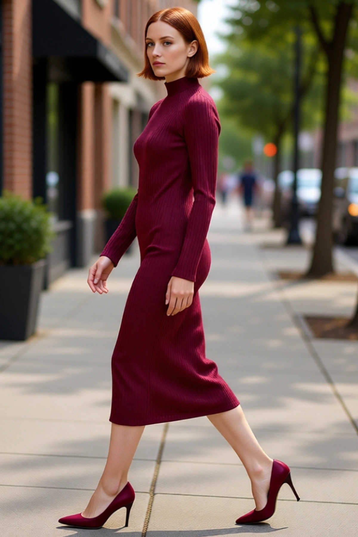Kadın Dik Yaka Uzun Kollu Bodycone Örme Midi Elbise Yırtmaçlı Fitilli Tasarım Soğuk Havalar İçin