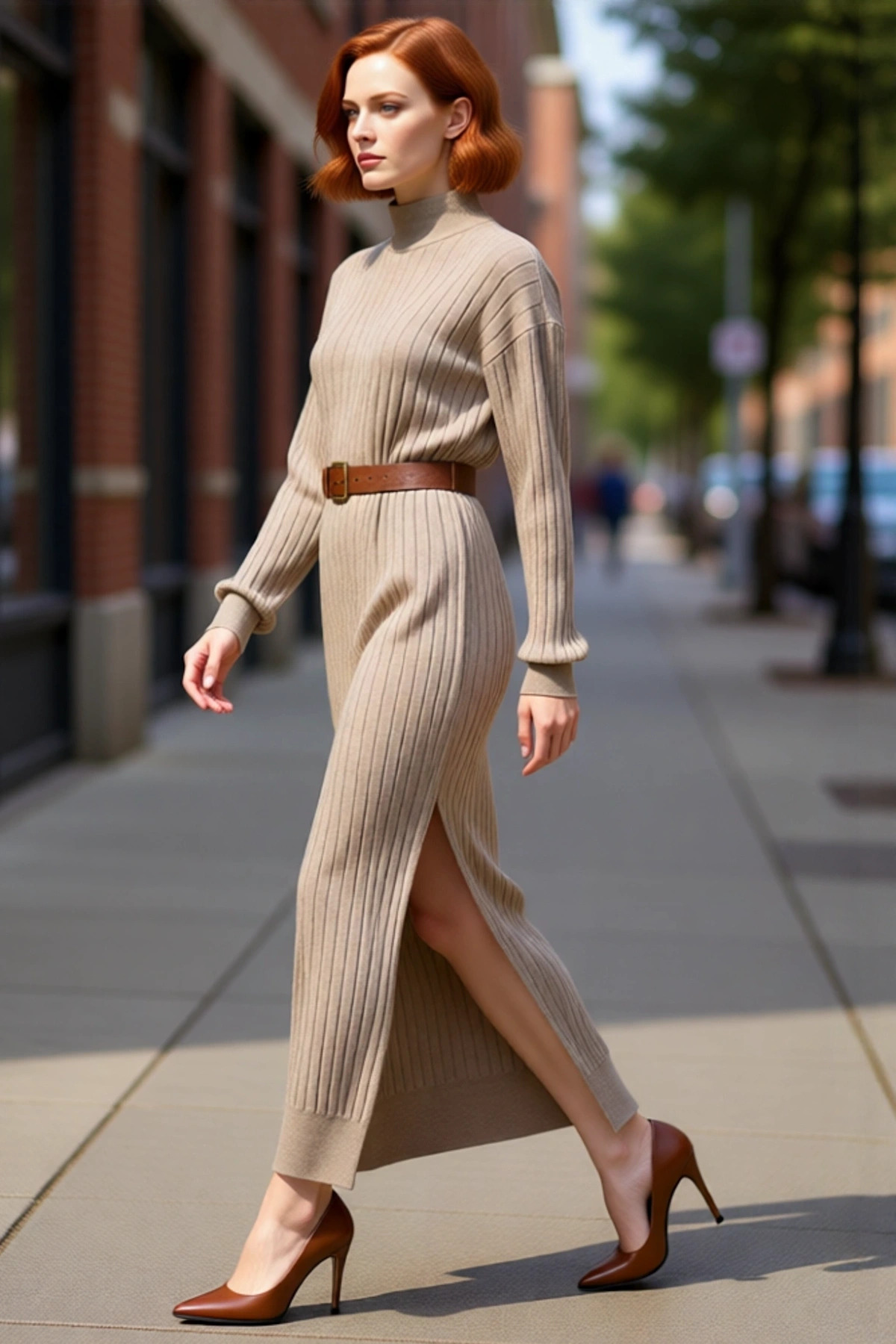 Kadın Günlük Akrilik Düşük Kol Dik Yaka Maxi Boy Triko Elbise Kemerli Yırtmaç Detaylı Soğuk Hava