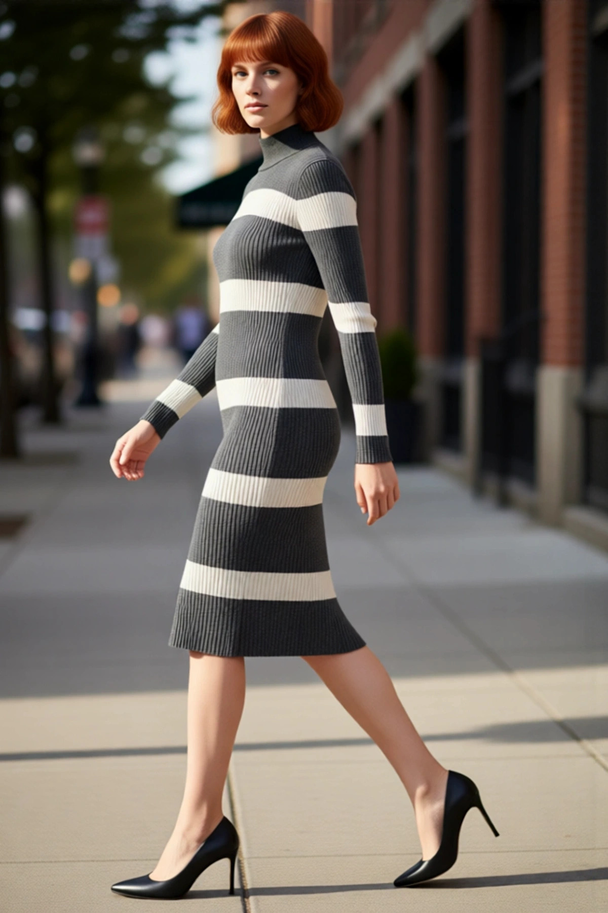 Kadın Çizgili Triko Midi Elbise Dik Yaka Uzun Kollu Bodycon Akrilik İnce Kumaş İlkbahar Sonbahar