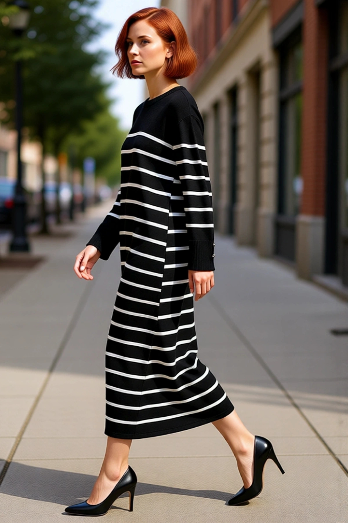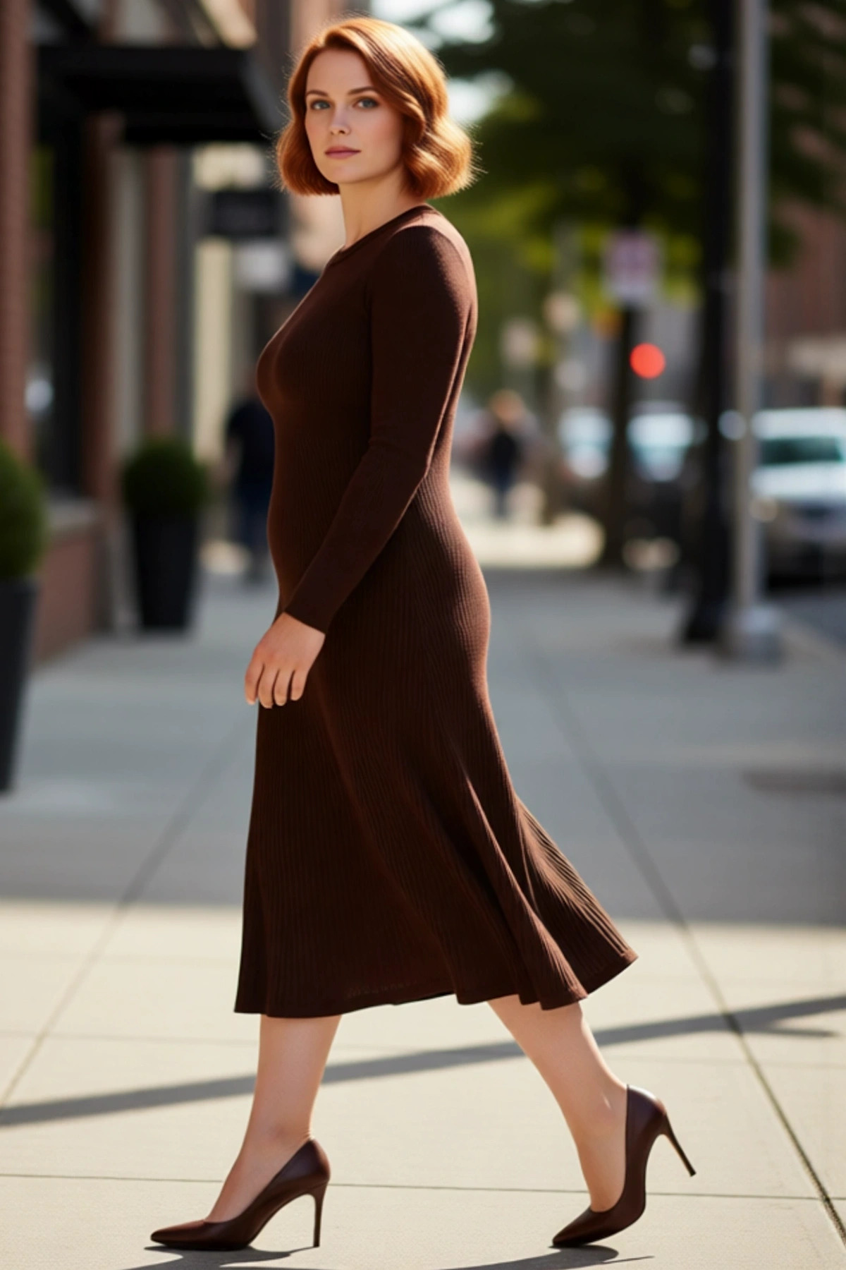 Kadın Bisiklet Yaka Midi Boy Uzun Kol Düz Desenli A line Kesim Fitilli Triko Elbise Rahatlığı