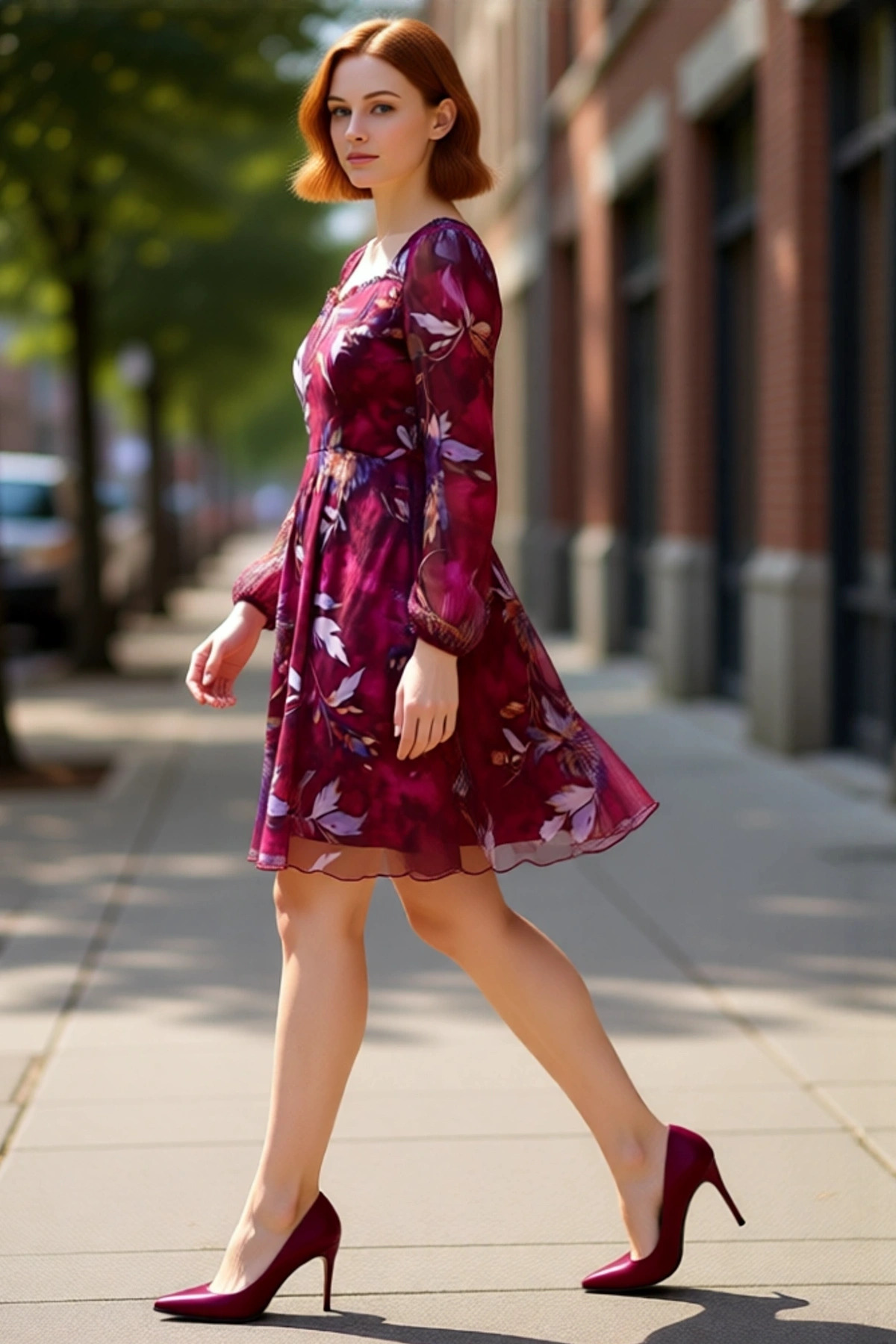 Kadın Büyük Beden Şifon Kalp Yaka Uzun Balon Kol Geometrik Desenli A Kesim Mini Elbise Kaliteli
