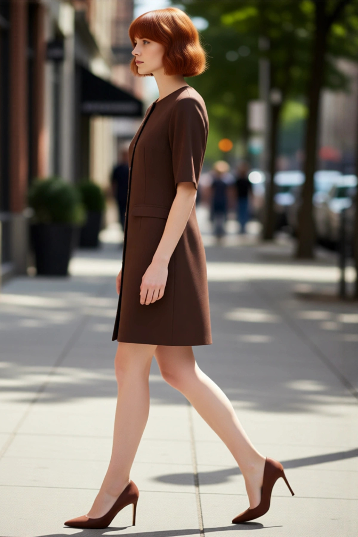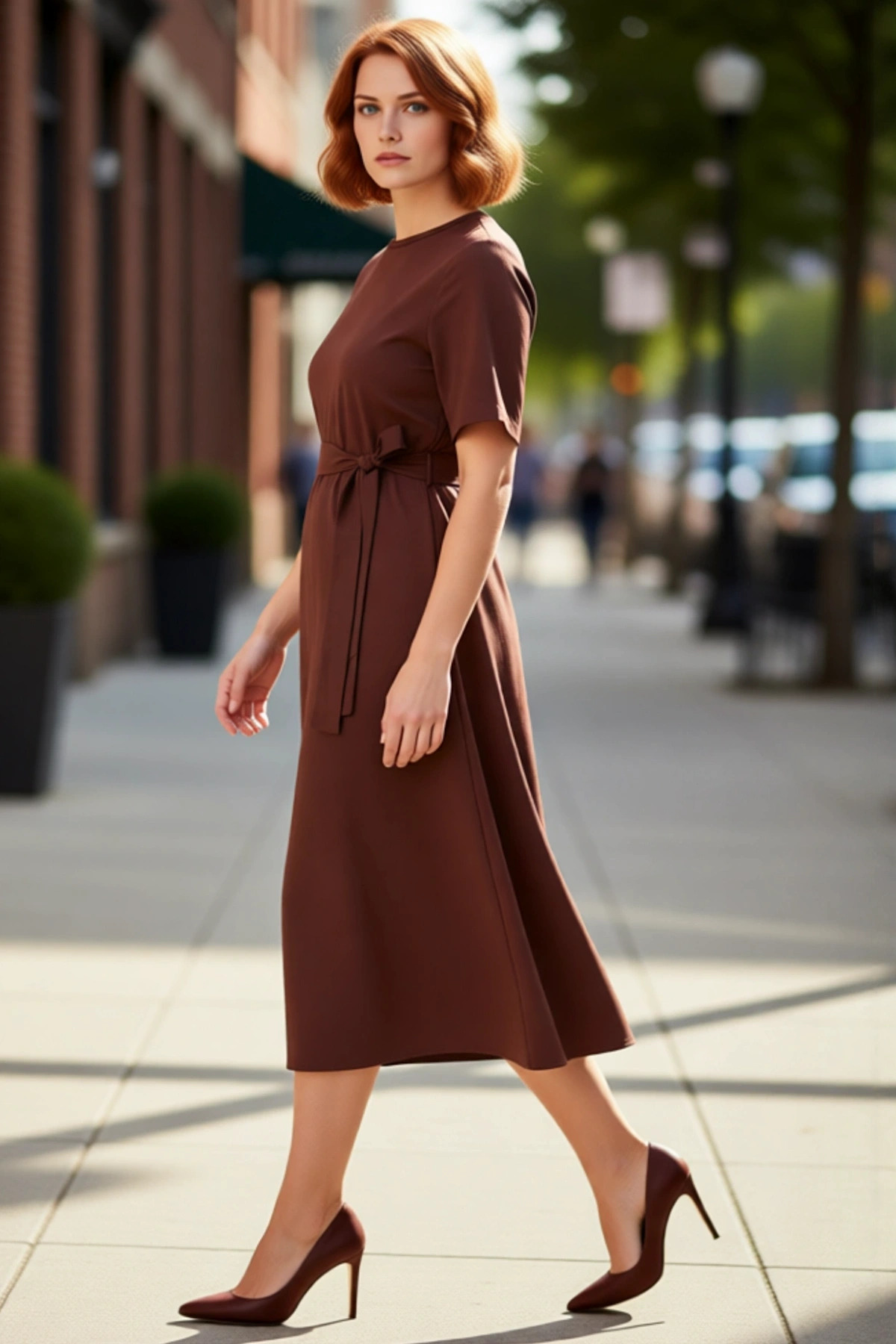 Kadın Kahverengi Düz Desen Kısa Kol A Line Dokuma Elbise Modern Mini Boy Ofis ve Günlük Kullanım