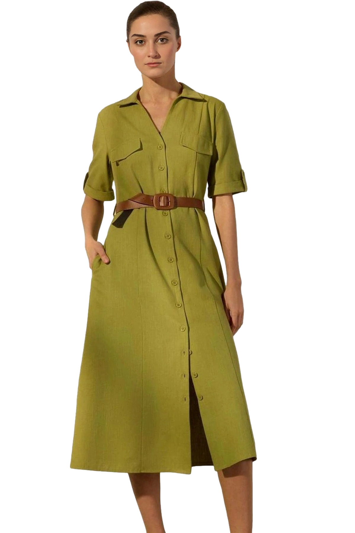 Keten Karışımlı Midi Gömlek Elbise Cepli Kemerli Rahat Kalıp Konforlu Kesim