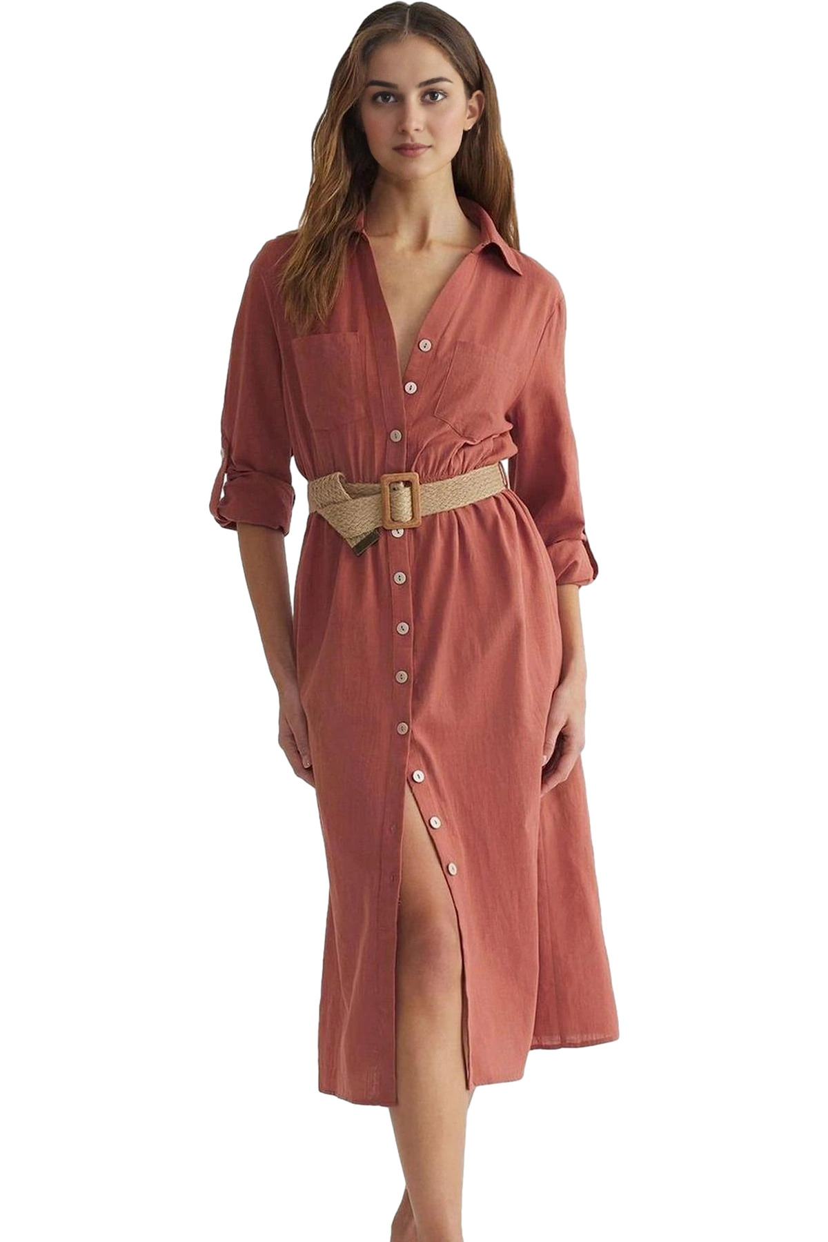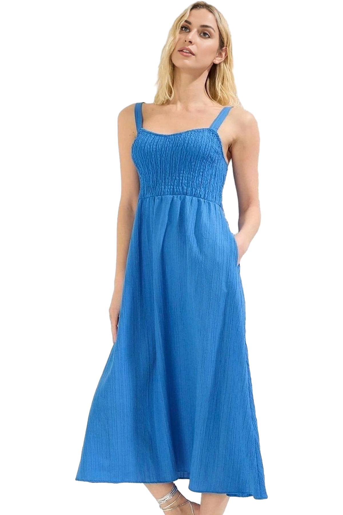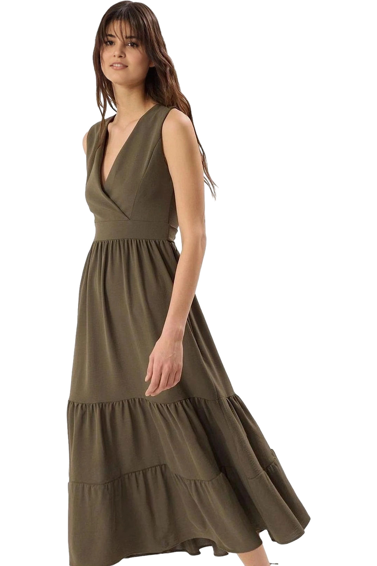 Rahat Yazlık Crinkle Dokuma Midi Elbise Belden Açılan Etek Gipeli V Yaka Tasarım Dayanıklı Malzeme