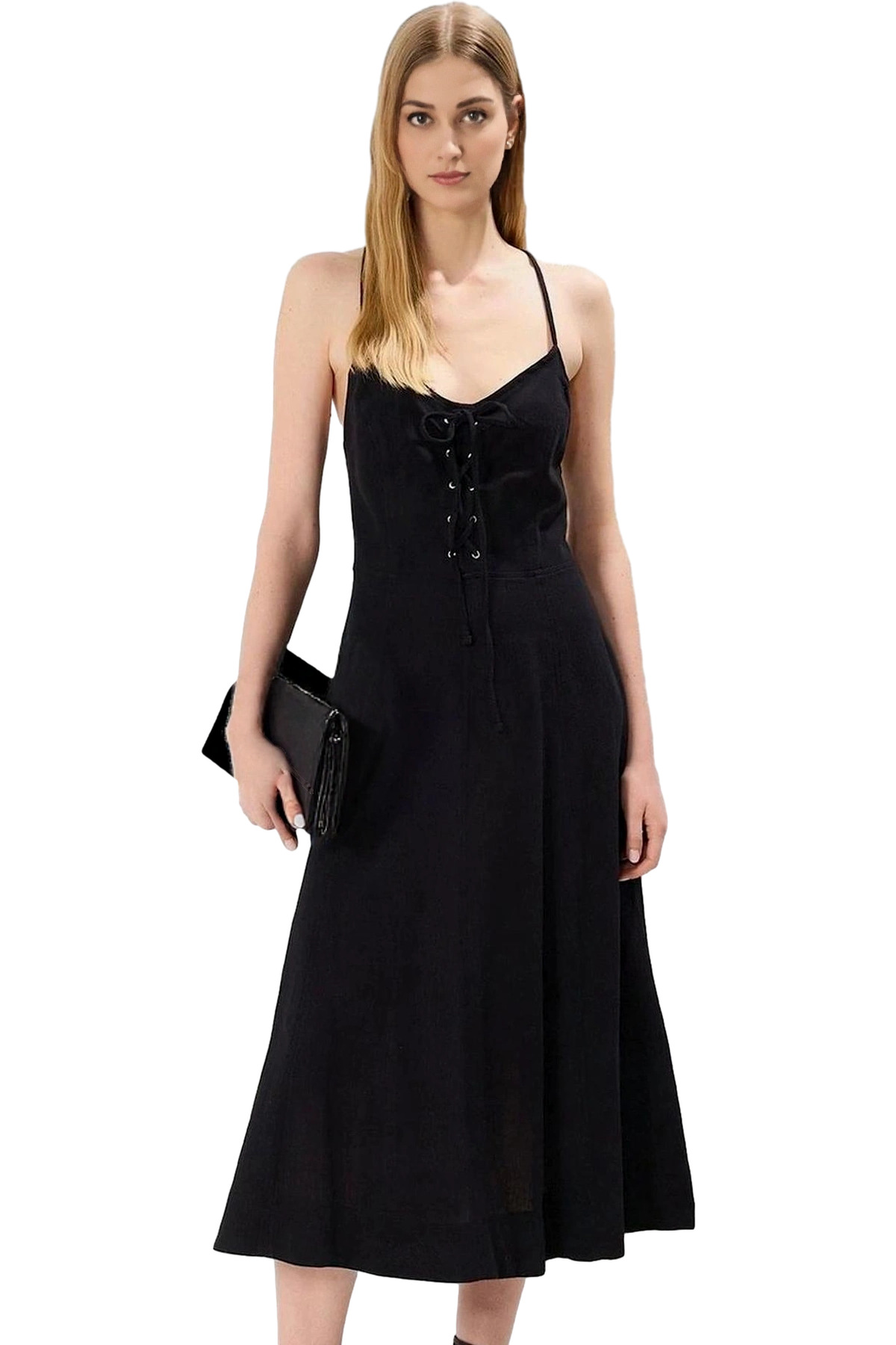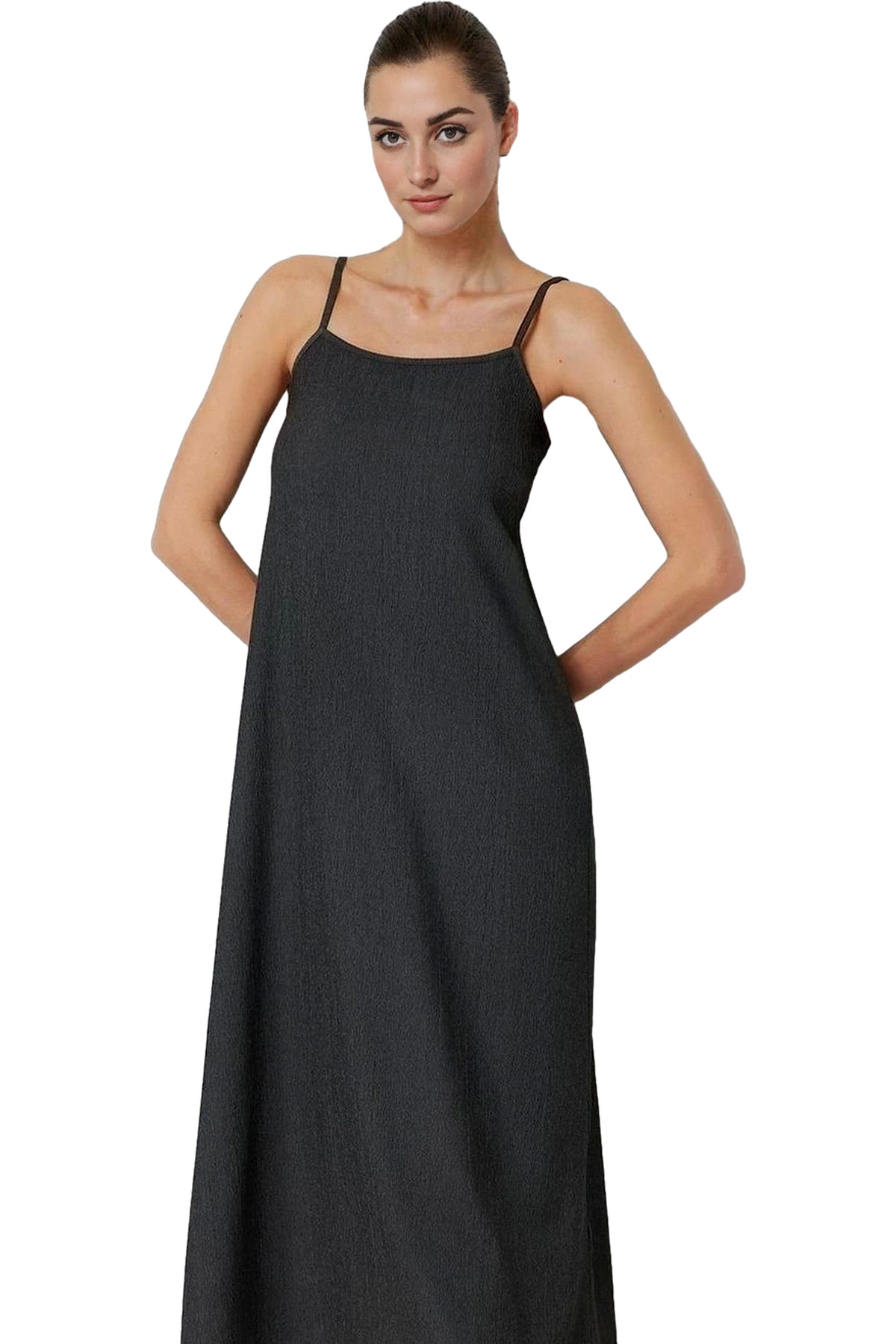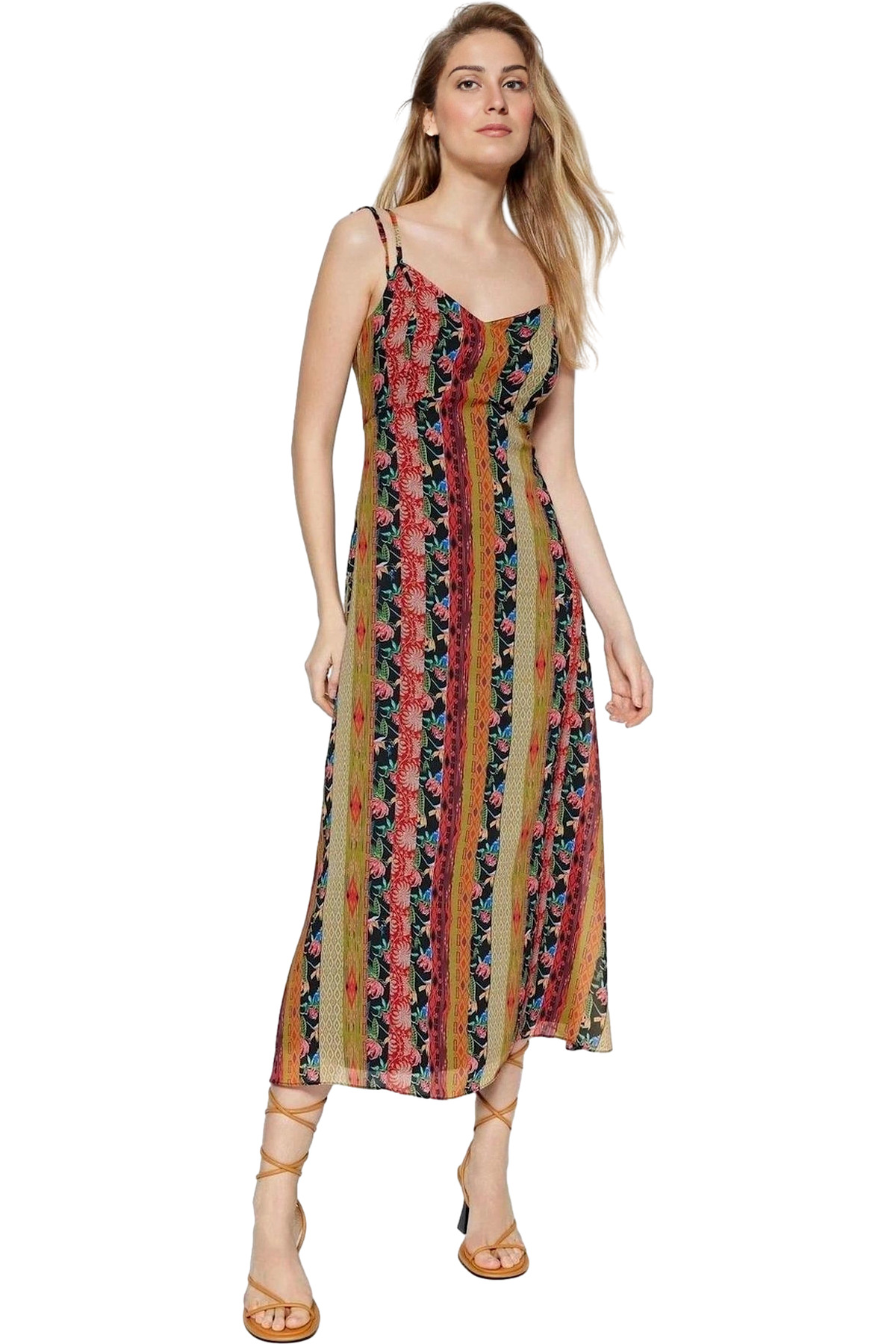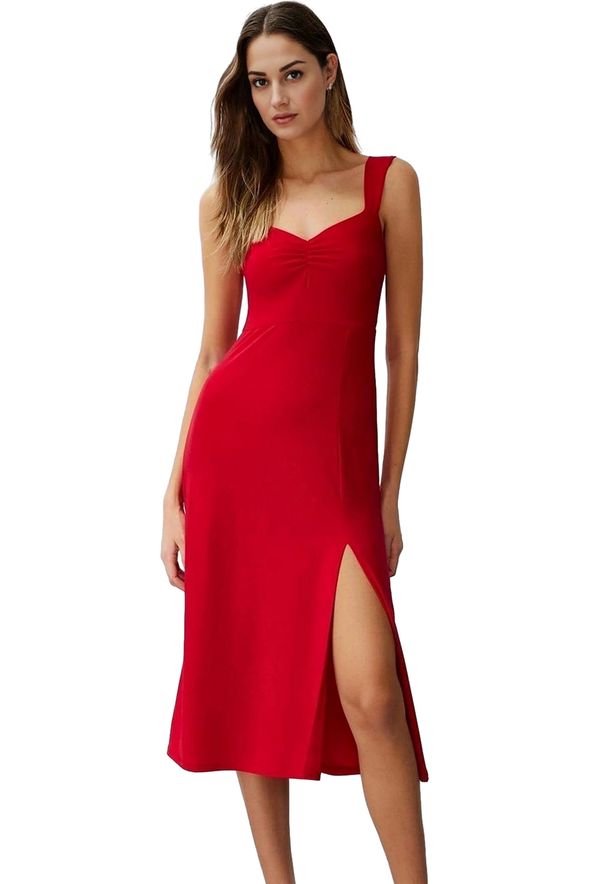 Yazlık Kadın Midi Elbise A line Kalın Askılı Kalp Yaka Örme Kumaş Seçkin Malzeme Mükemmel Uyum