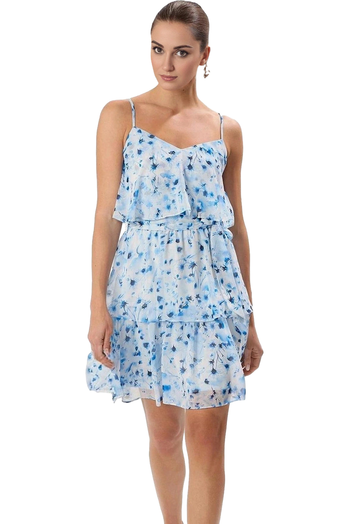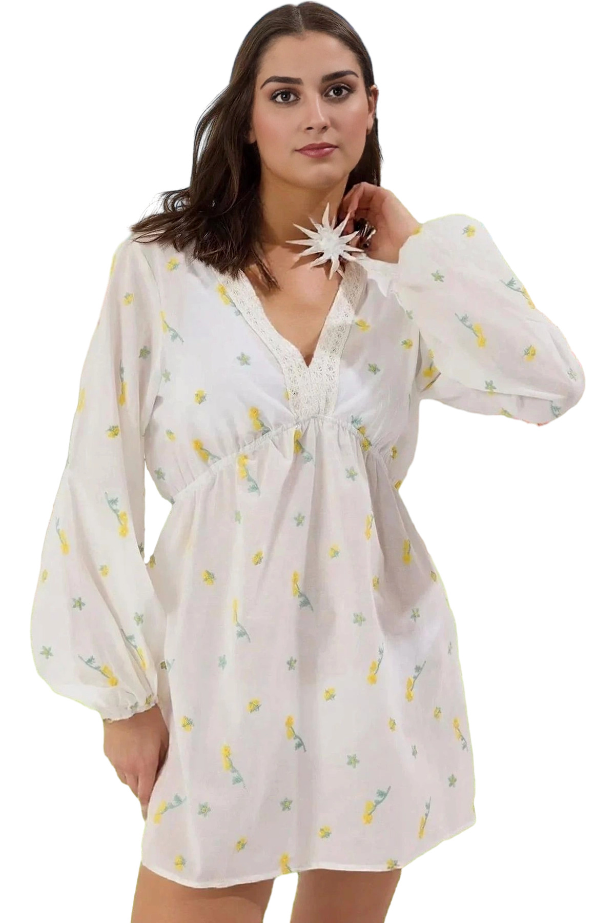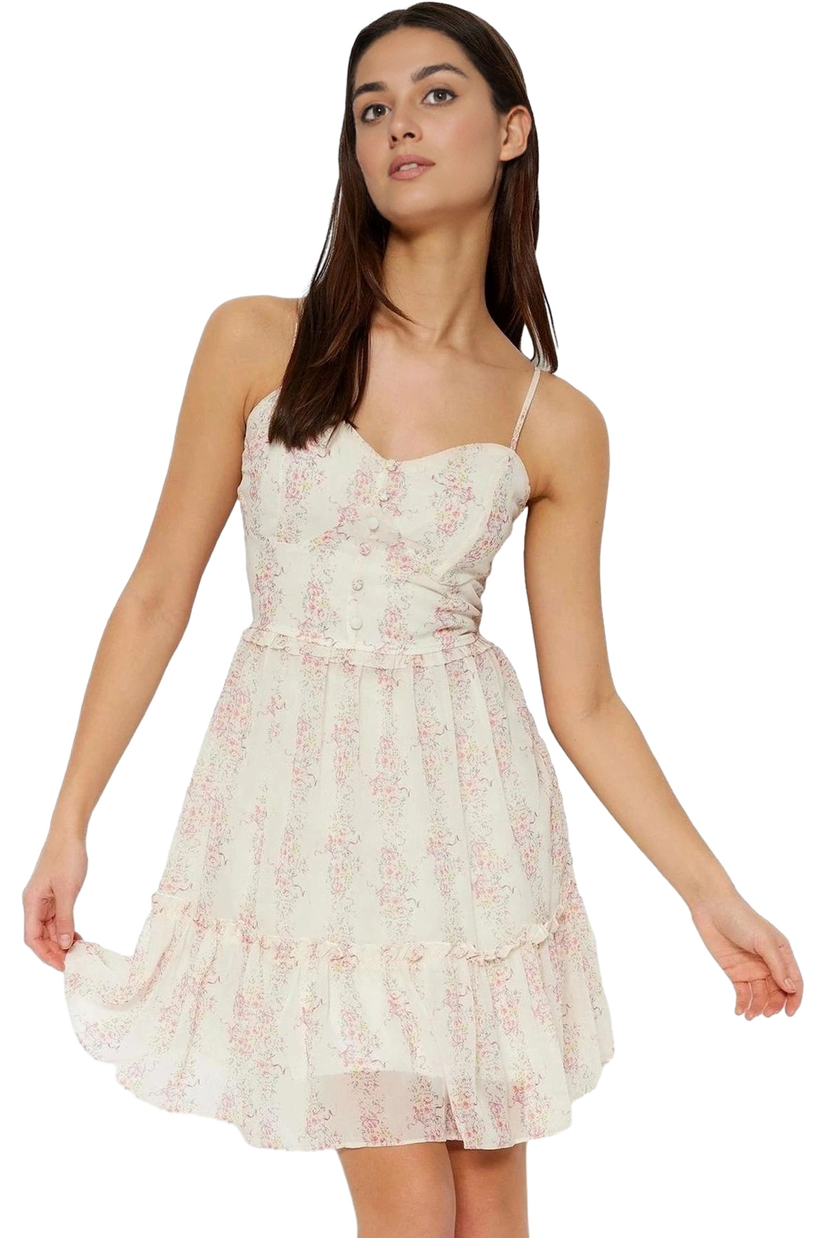 Şifon Kumaş Mini Elbise V Yaka Çiçek Desenli Skater Kalıp Rahat Seçkin Malzeme Konforlu Kesim