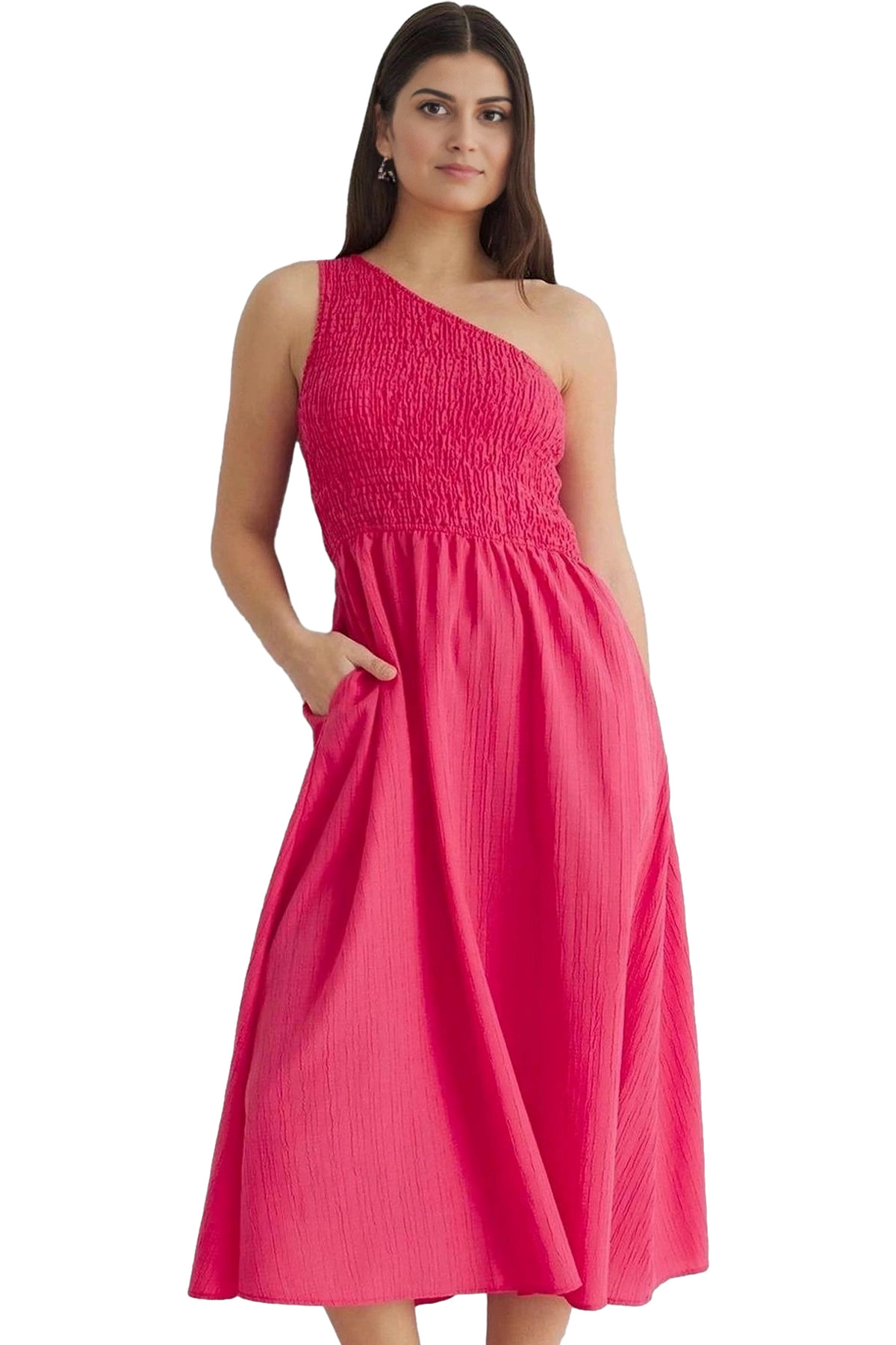 Şık Keten Görünümlü Kuşaklı Midi Elbise Rahat ve Nefes Alabilir Günlük Kullanım İçin Modern Stil
