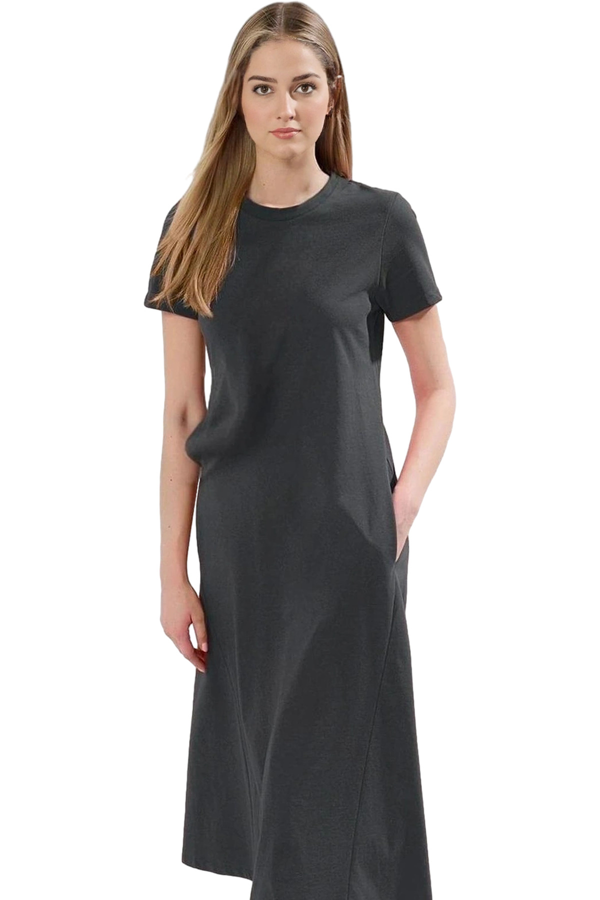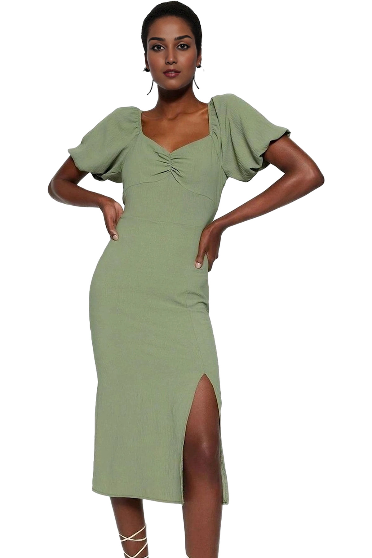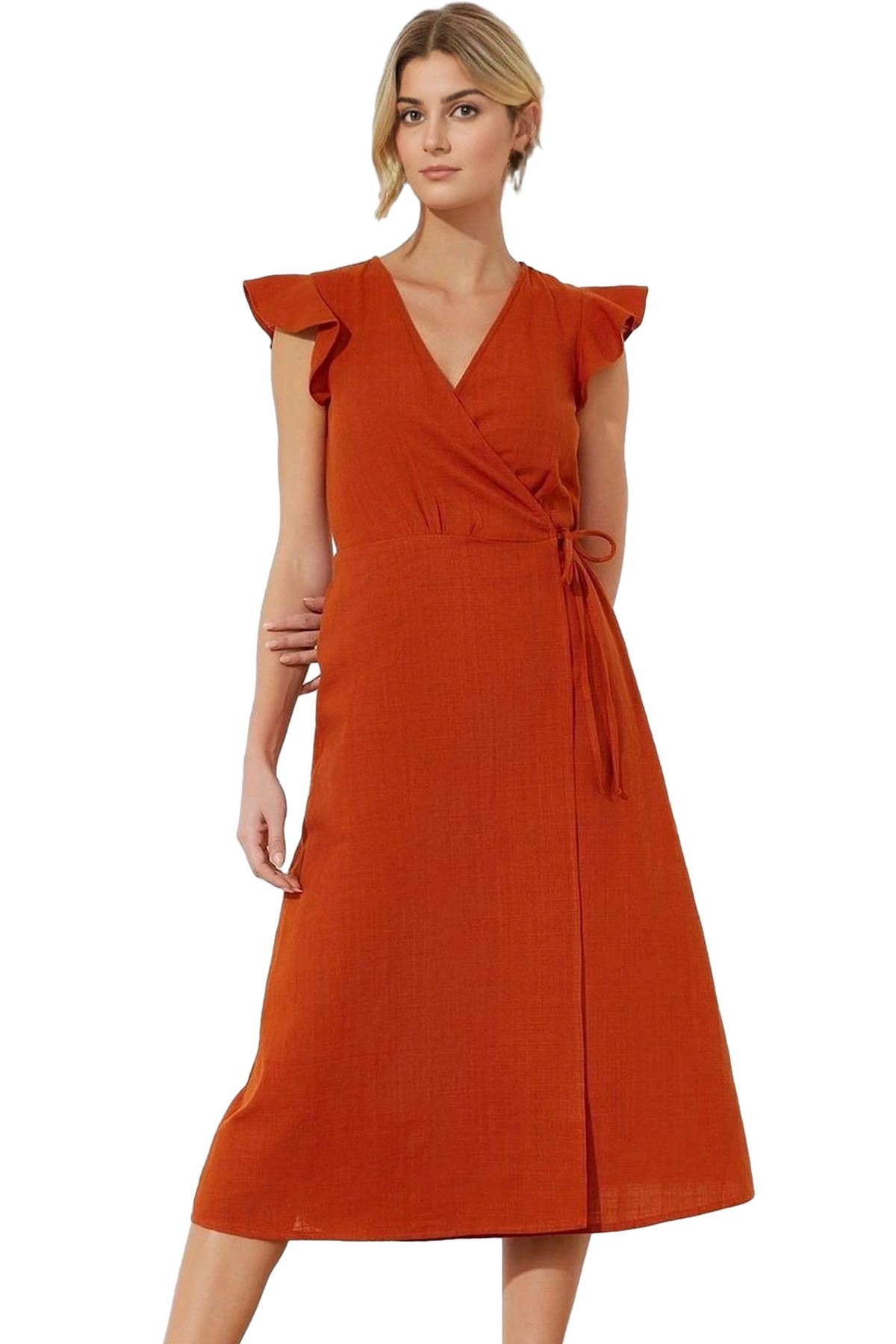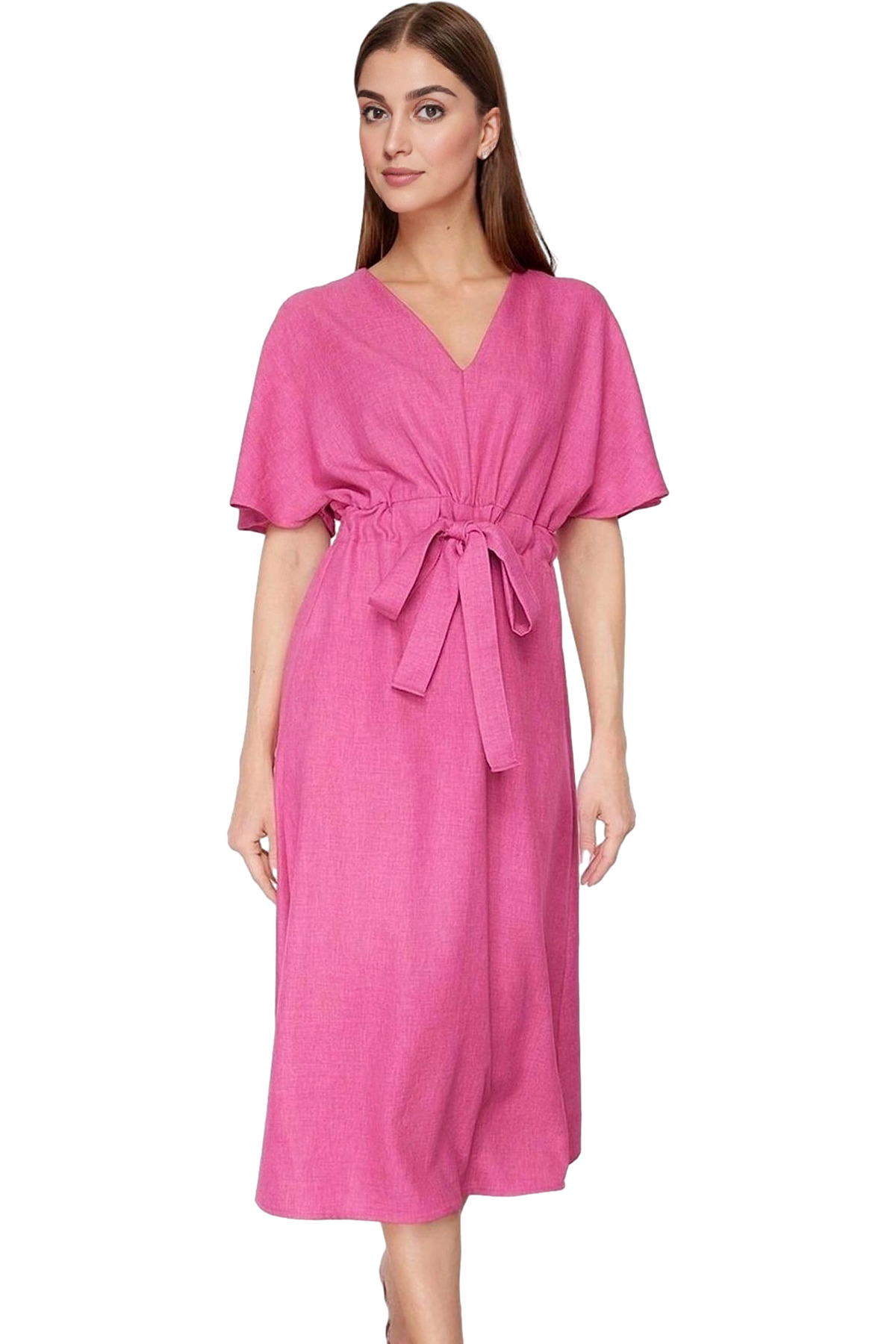 Kısa Kollu Keten Görünümlü Midi Elbise V Yaka Kruvaze Rahat Kalıp Mükemmel Uyum Yüksek Kalite