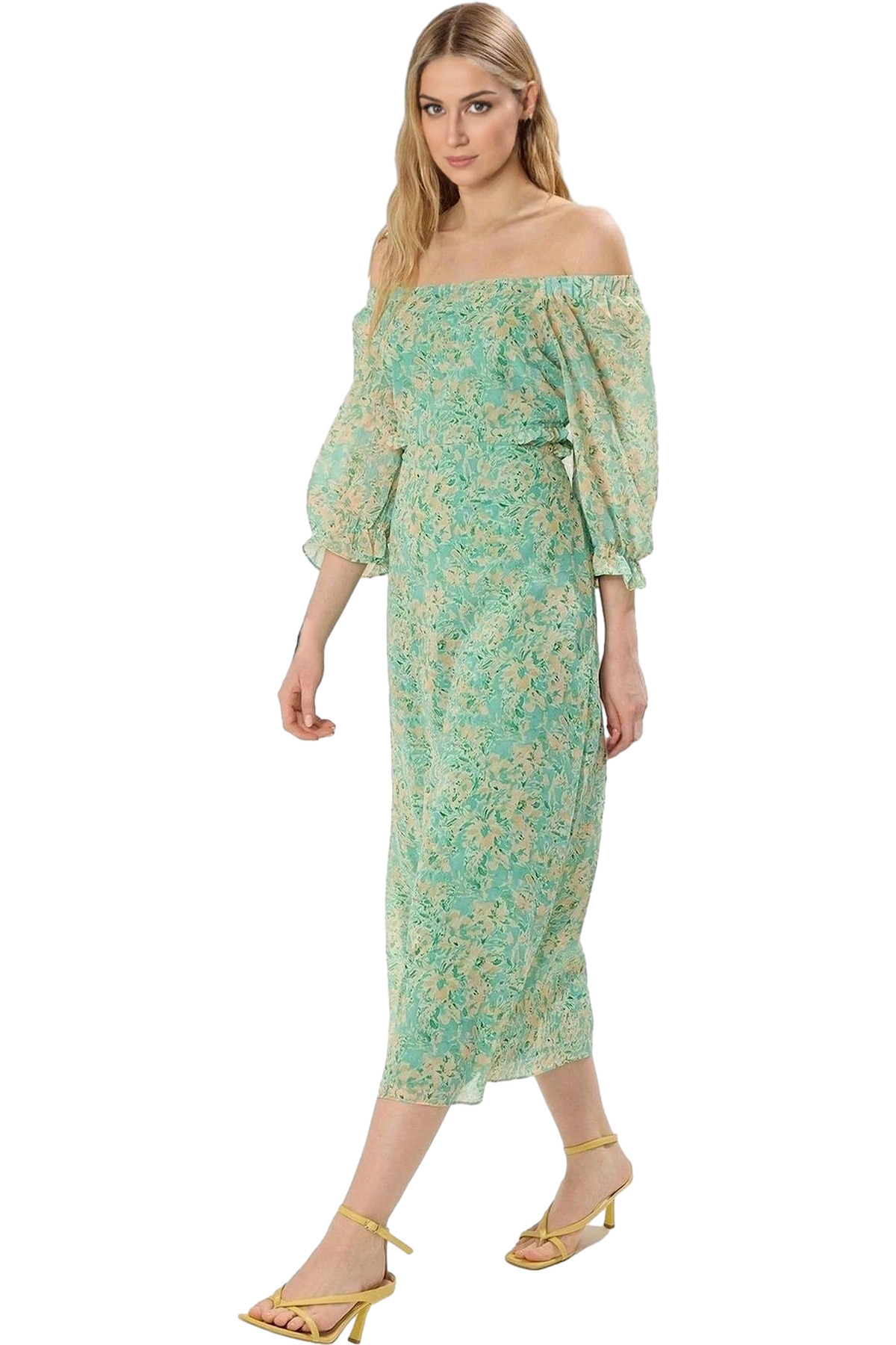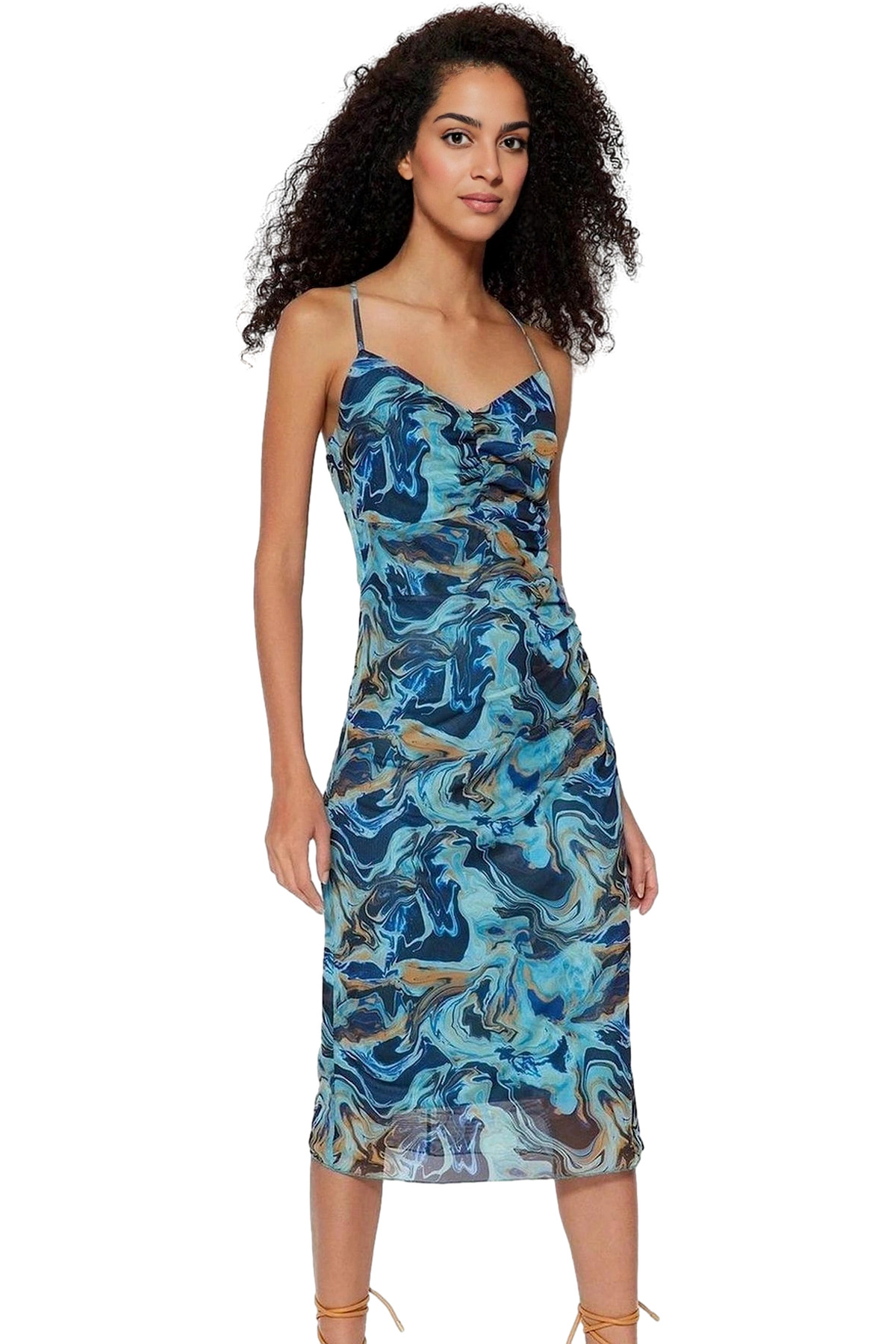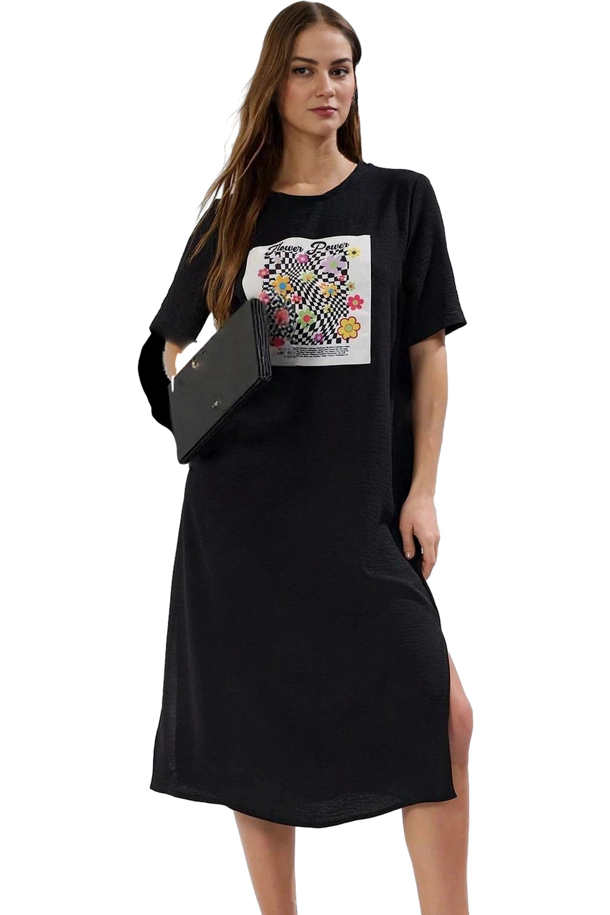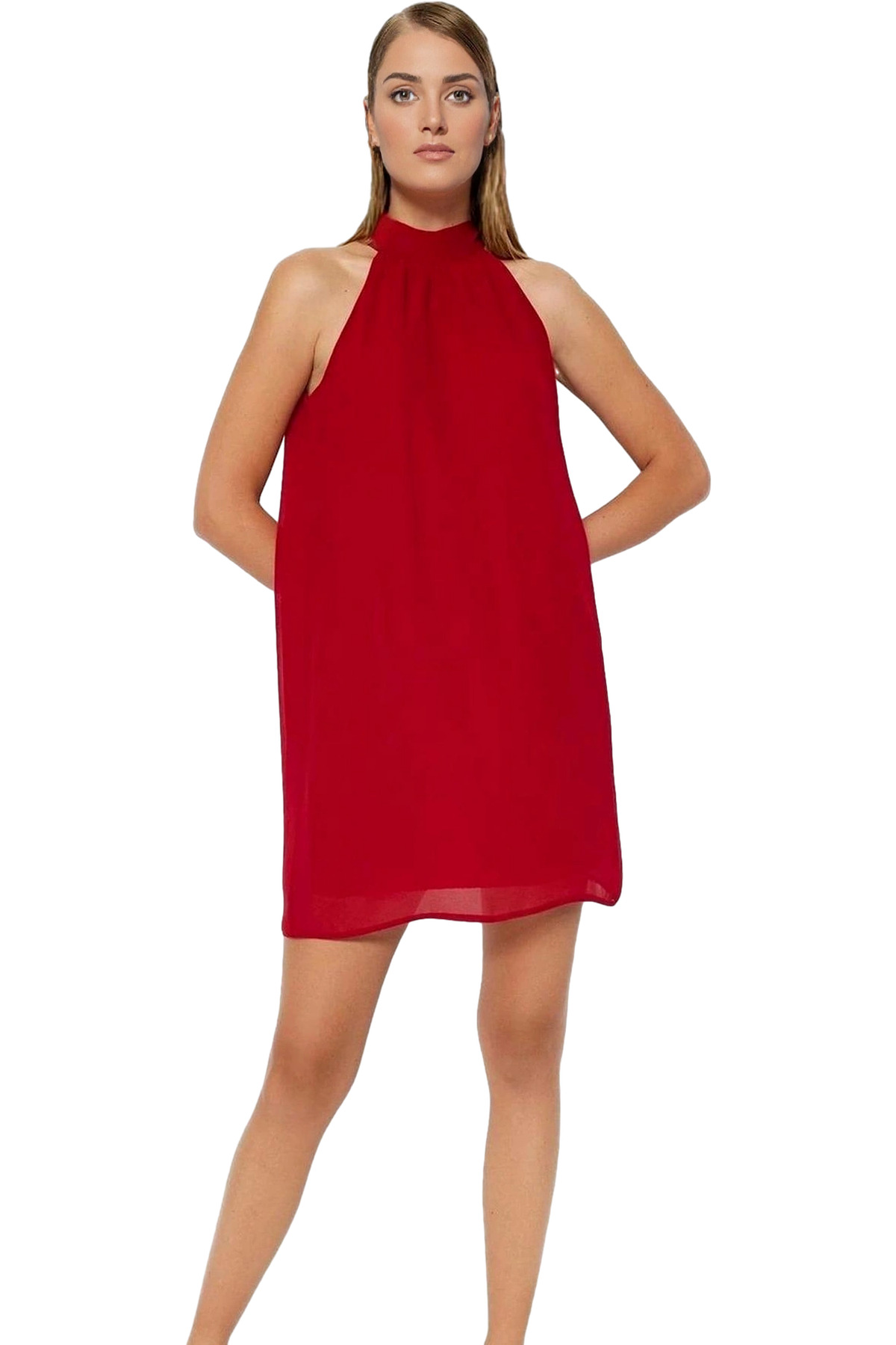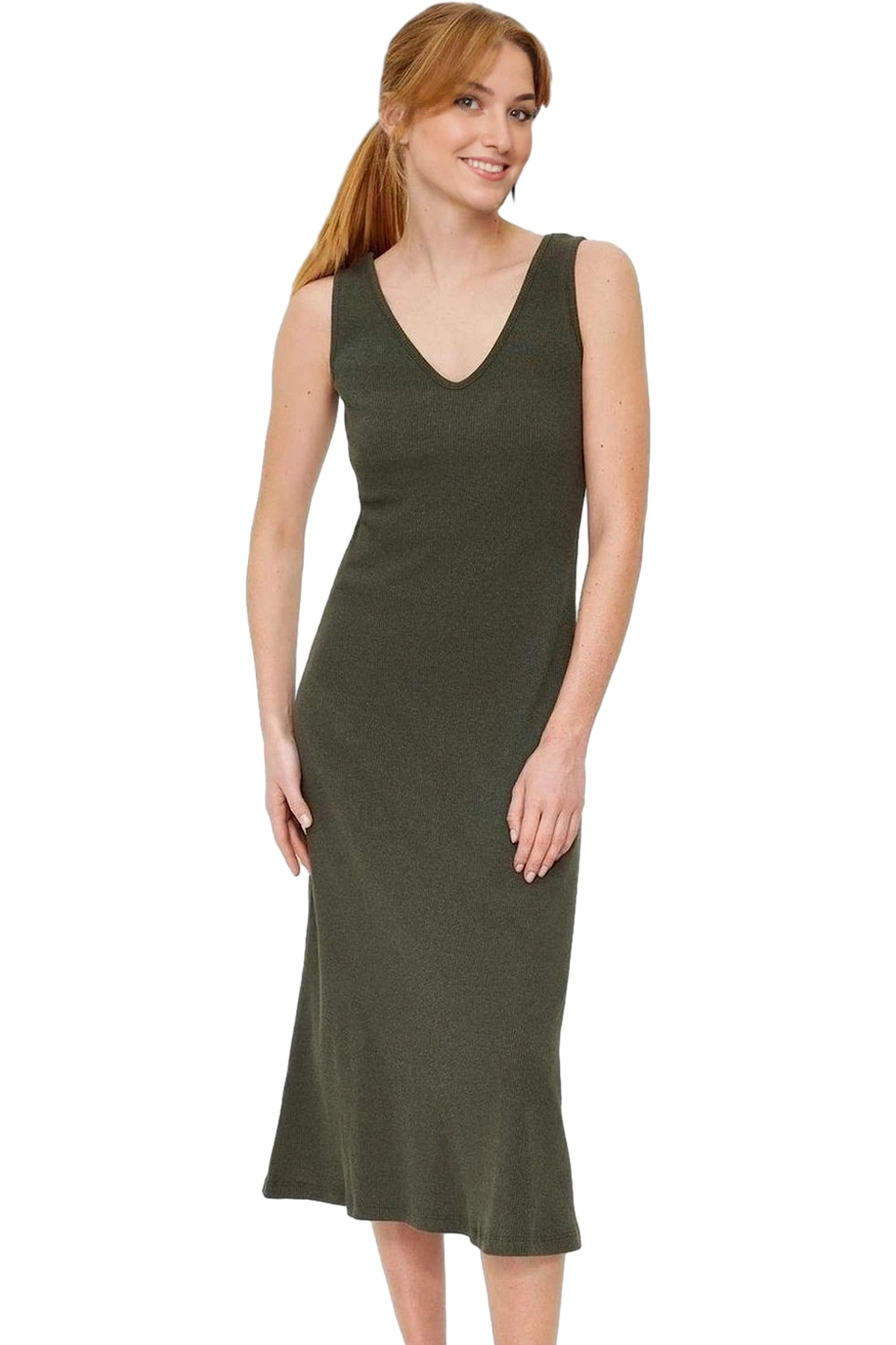 Kısa Kollu Keten Görünümlü Midi Elbise V Yaka Kruvaze Rahat Kalıp Mükemmel Uyum Yüksek Kalite