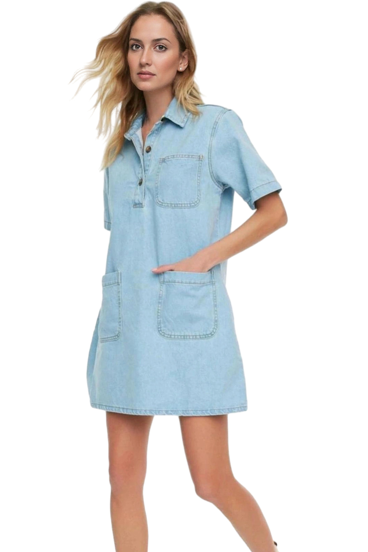 Kısa Kollu Denim Gömlek Elbise Mini Boy Casual Günlük Pamuk Yüksek Kalite Profesyonel Görünüm