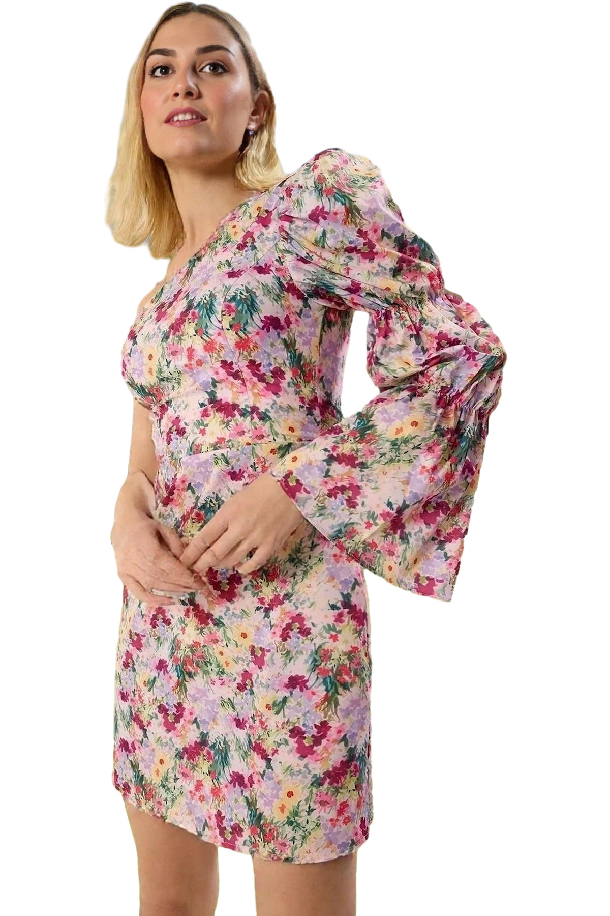 Asimetrik Yaka Çiçekli Poplin Mini Elbise Bodycon Kalıp Mükemmel Uyum Şık Görünüm Rahat Kullanım