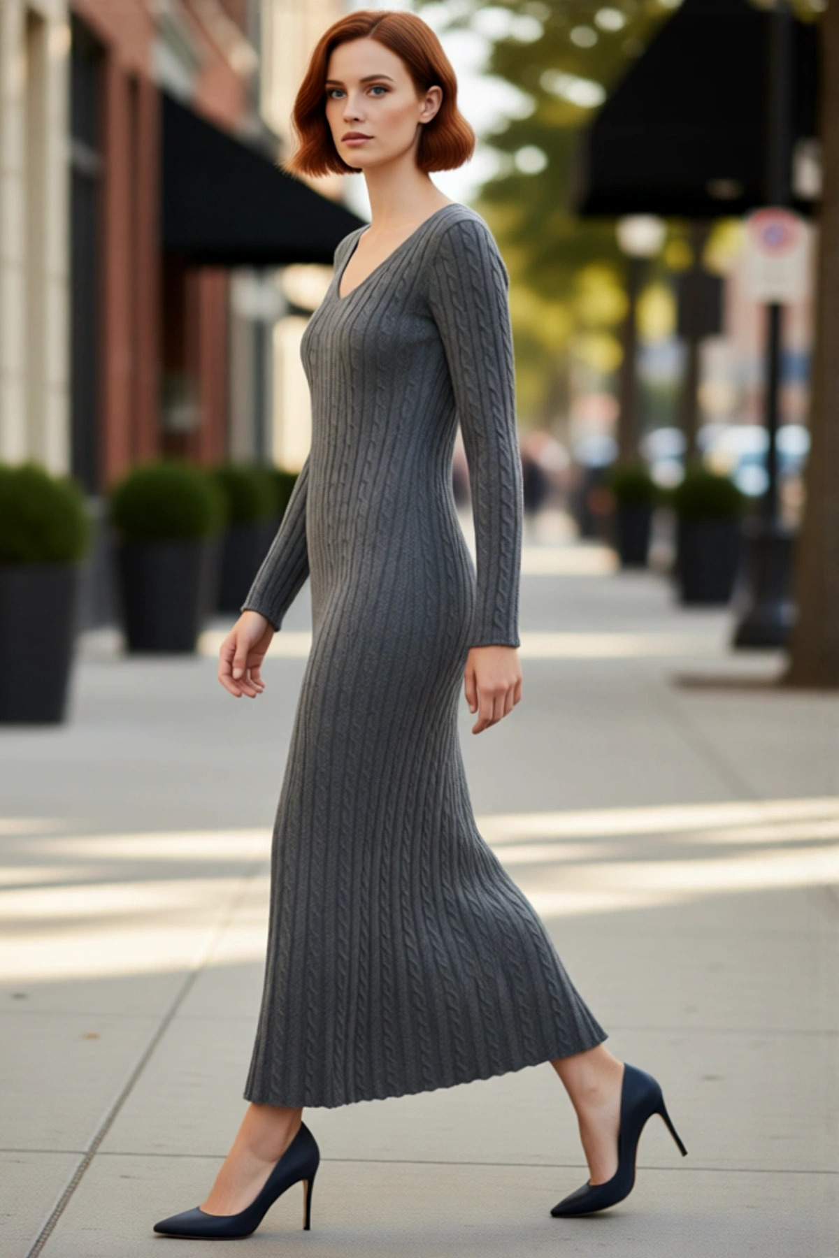 Kadın Uzun Kollu Triko Saç Örgü Desenli V Yaka Maxi Elbise A Line Kesim Kış Günlük Kombinlerde