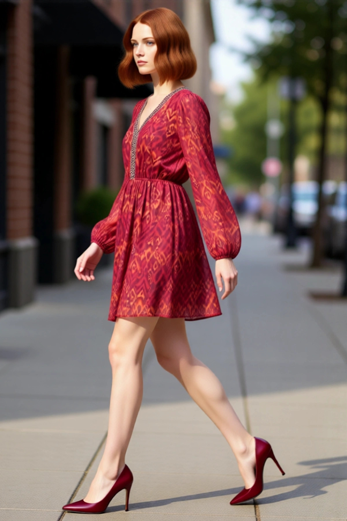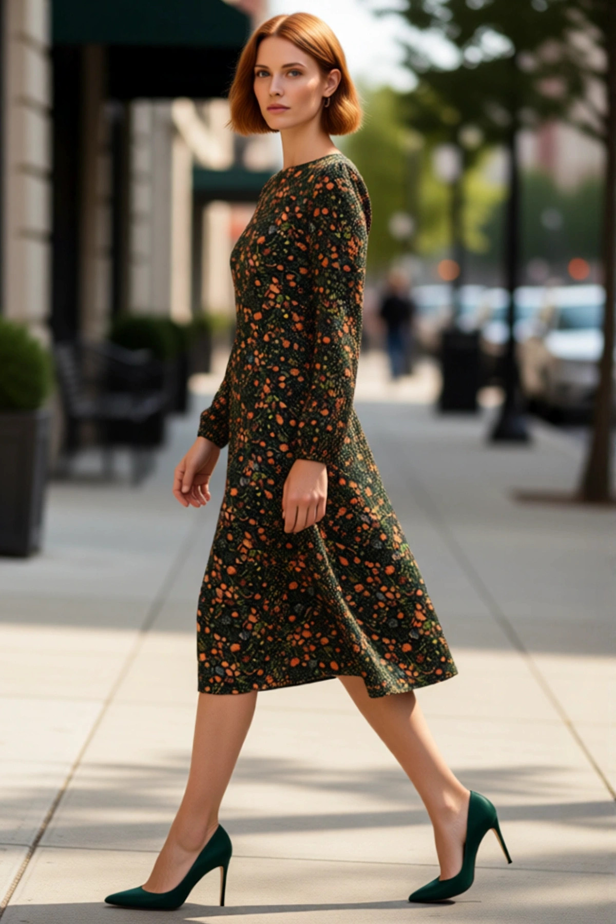 Kadın Şık Yırtmaç Detaylı Kalp Yaka Balon Kol Uzun Kollu A Kesim Midi Boy Soyut Desenli Elbise