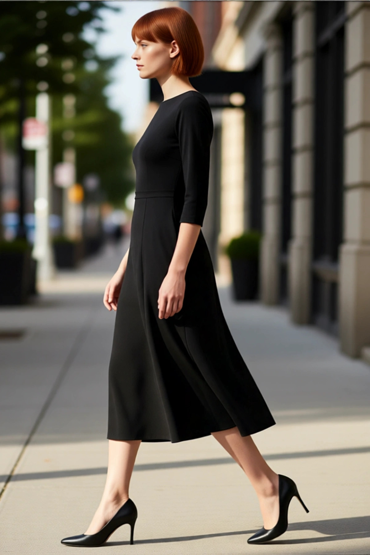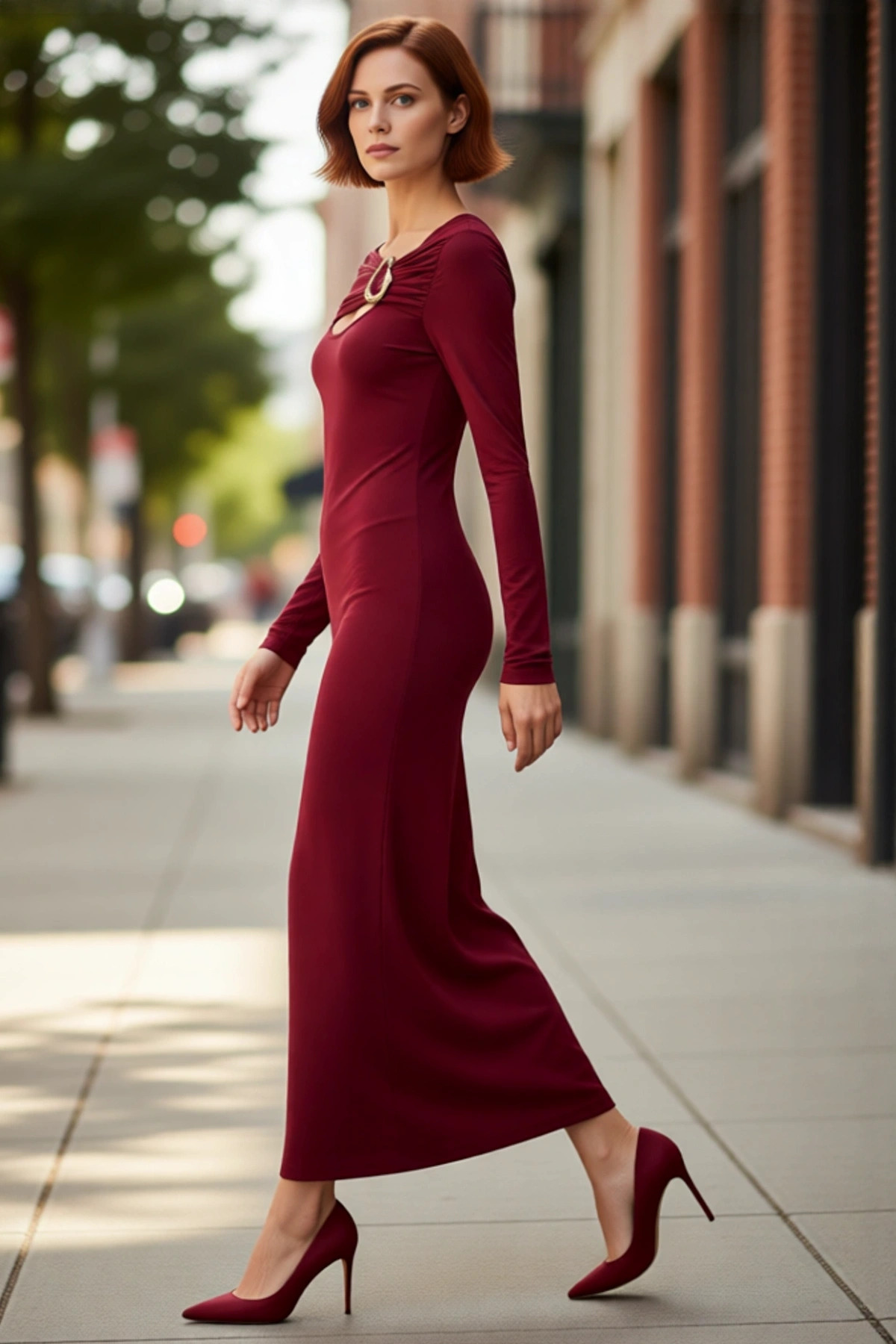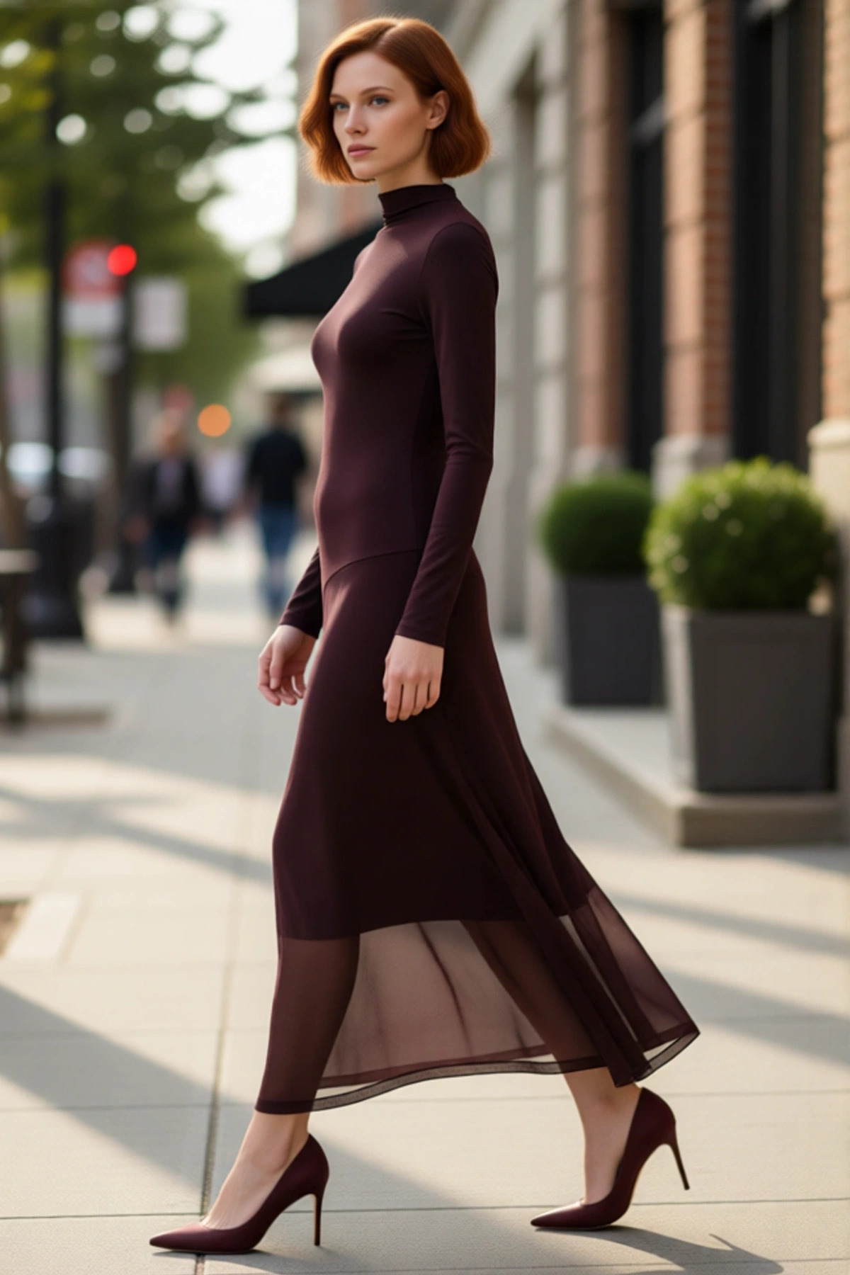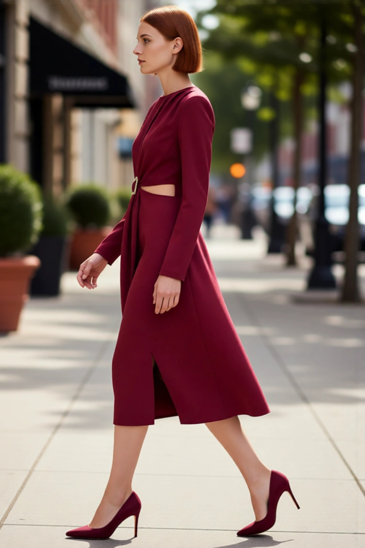 Kadın Düz Desen Midi Boy Uzun Kollu Bisiklet Yaka A line Dokuma Cut Outlı Kışlık Elbise Kaliteli