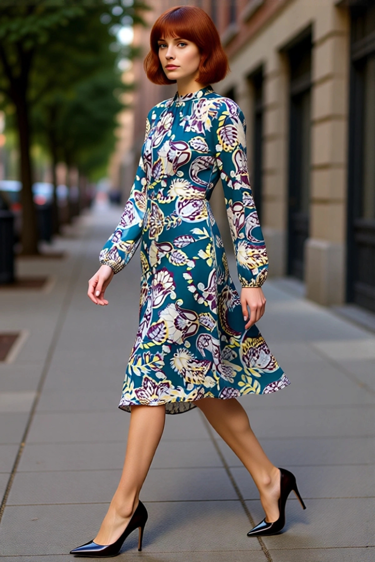 Kadın Şifon Patchwork Mini Elbise İlkbahar Sonbahar Modası Bisiklet Yaka Skater Kalıp Uzun Kollu