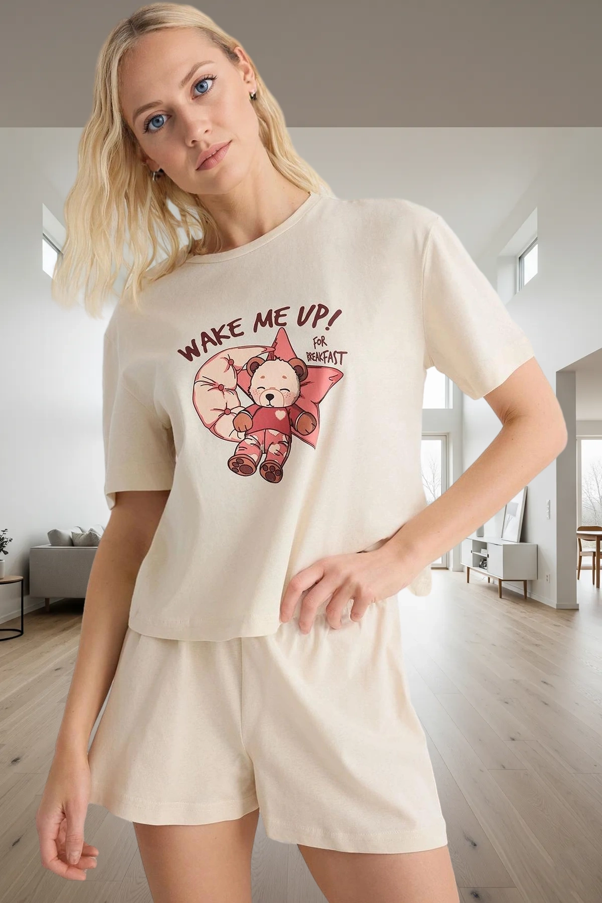 Yazlık 0 Pamuk Kadın Pijama Takımı Ayıcık ve Galaksi Baskılı Zarifane Tasarım Özenle Seçilmiş