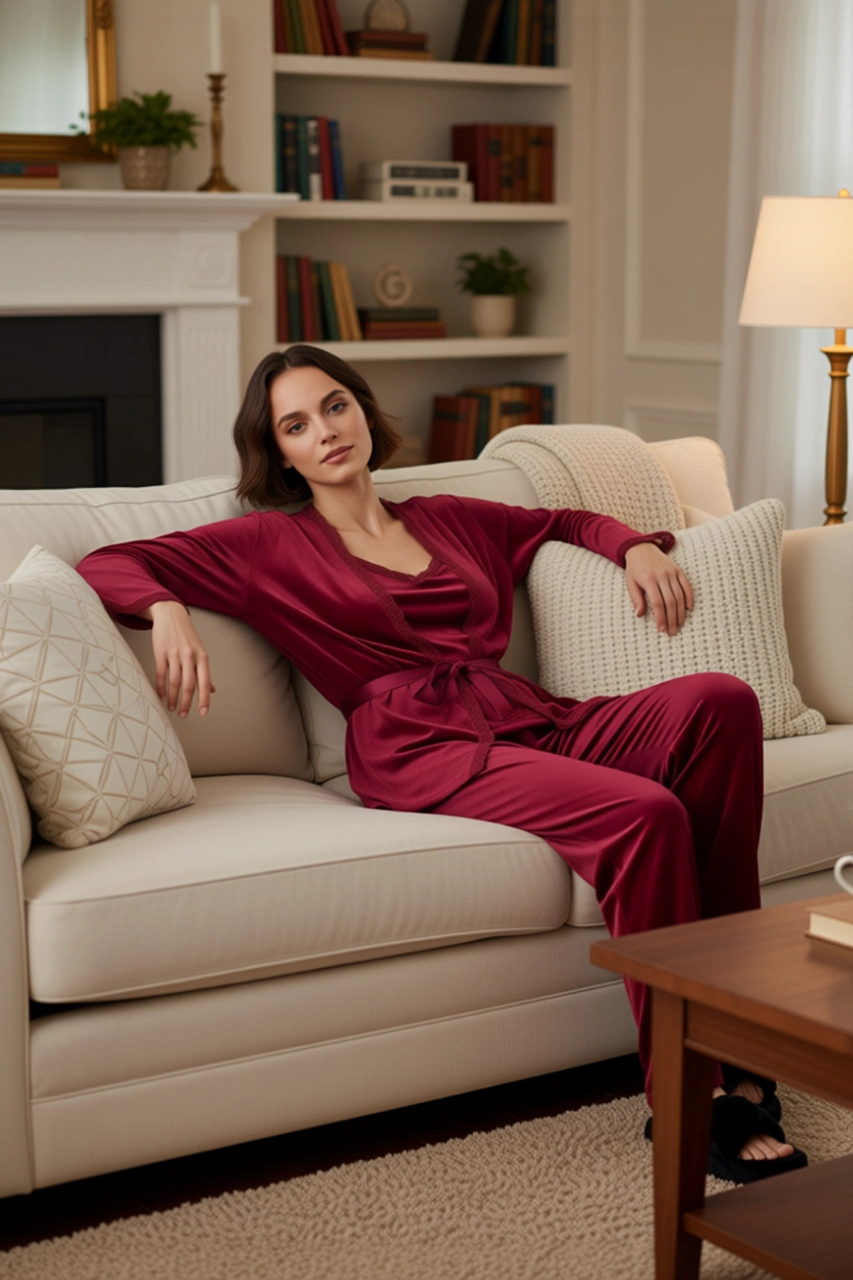 Kadın Kadife Pijama ve Sabahlık Seti Dantel Detaylı Fonksiyonel Dayanıklı Kaliteli Estetik
