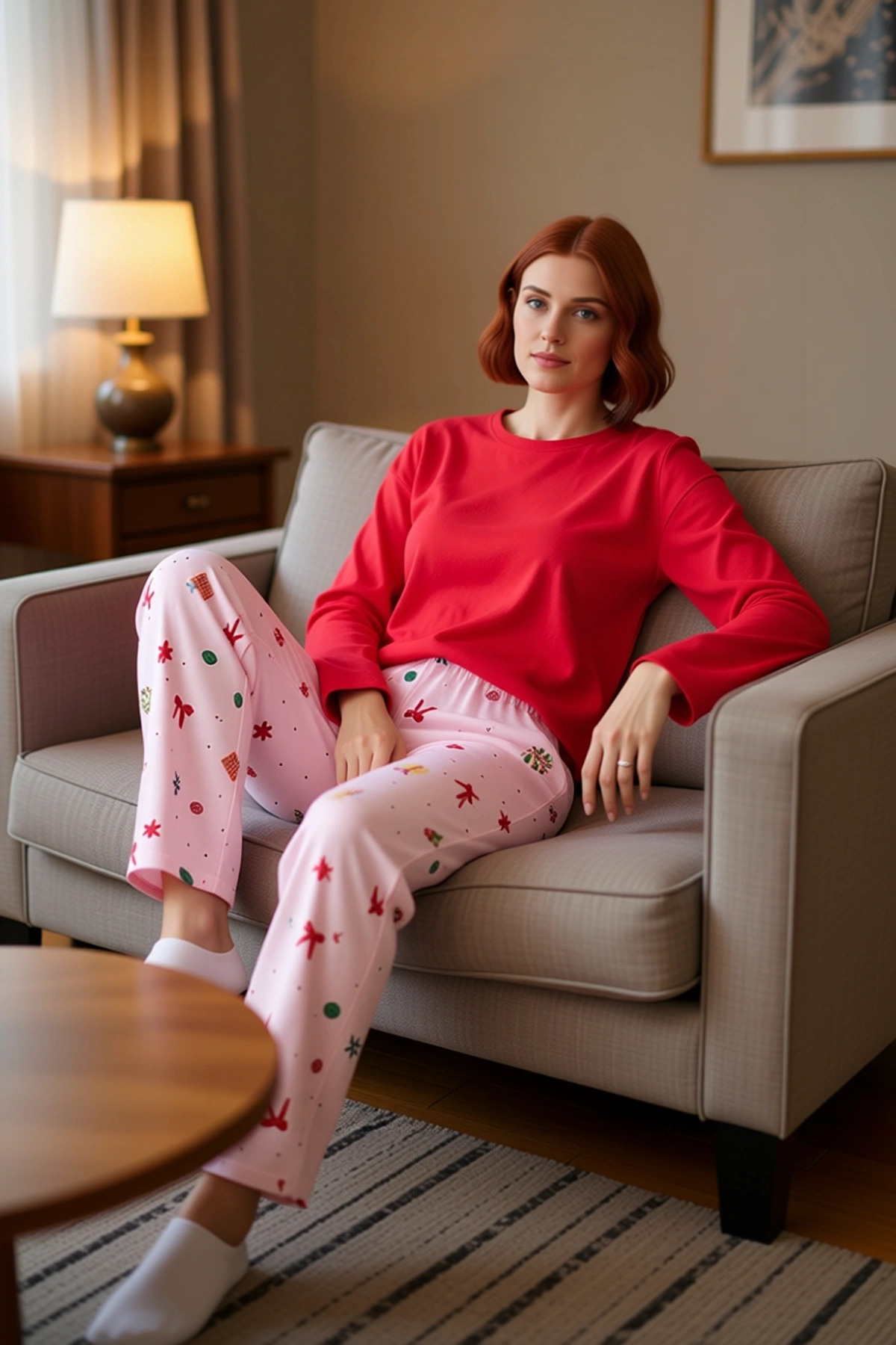 Kadın Yılbaşı Desenli Pamuklu Pijama Takımı Fonksiyonel Dayanıklı Kaliteli Konforlu Modern