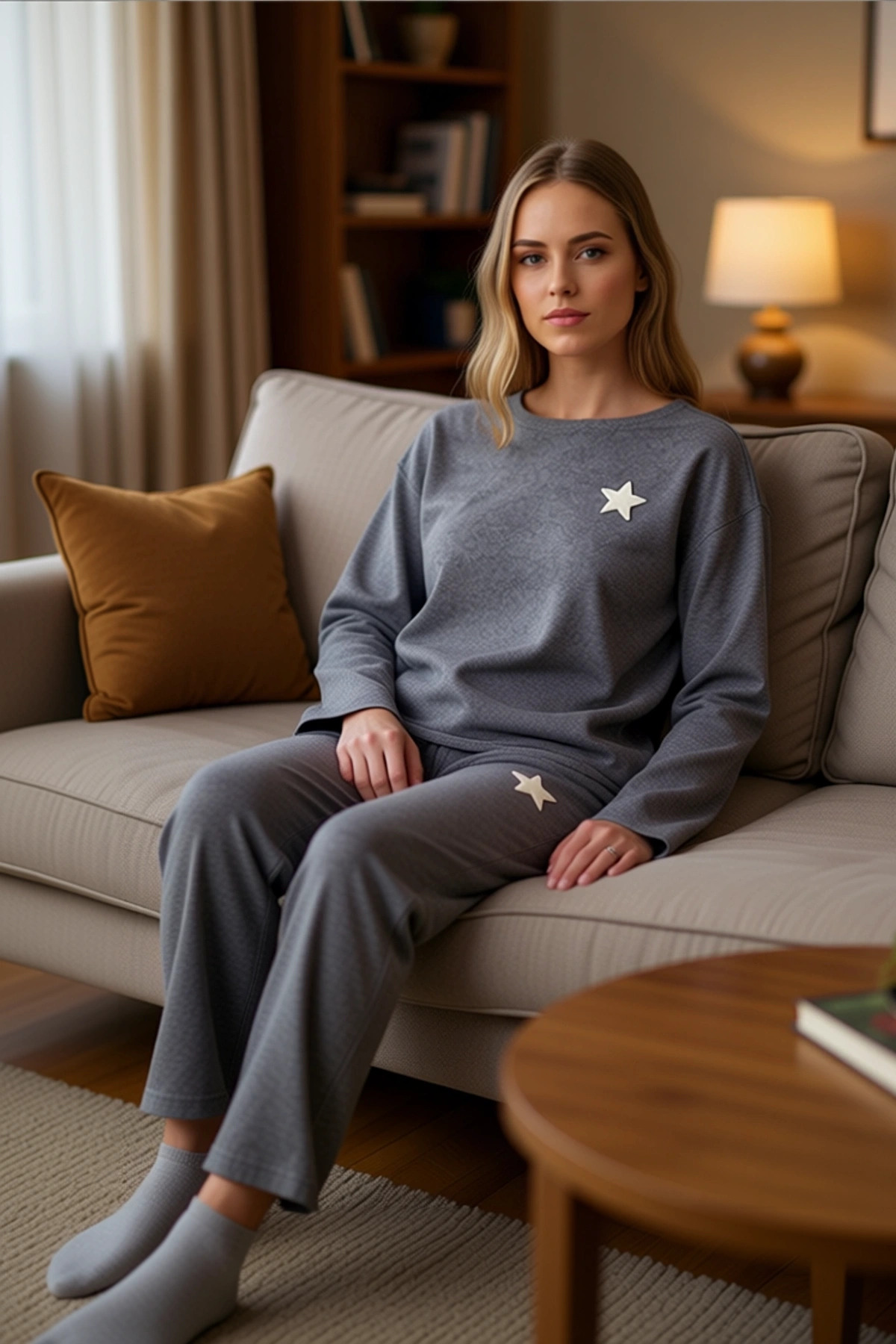 Kadın Yıldız Detaylı Uzun Kollu Pijama Takımı Fonksiyonel Dayanıklı Kaliteli Konforlu Spor