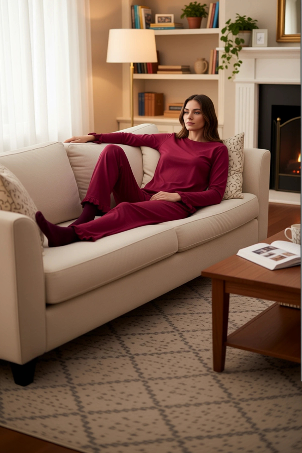 Kadın Fırfırlı Bisiklet Yaka Uzun Kollu Pijama Takımı Fonksiyonel Dayanıklı Kaliteli Rahat