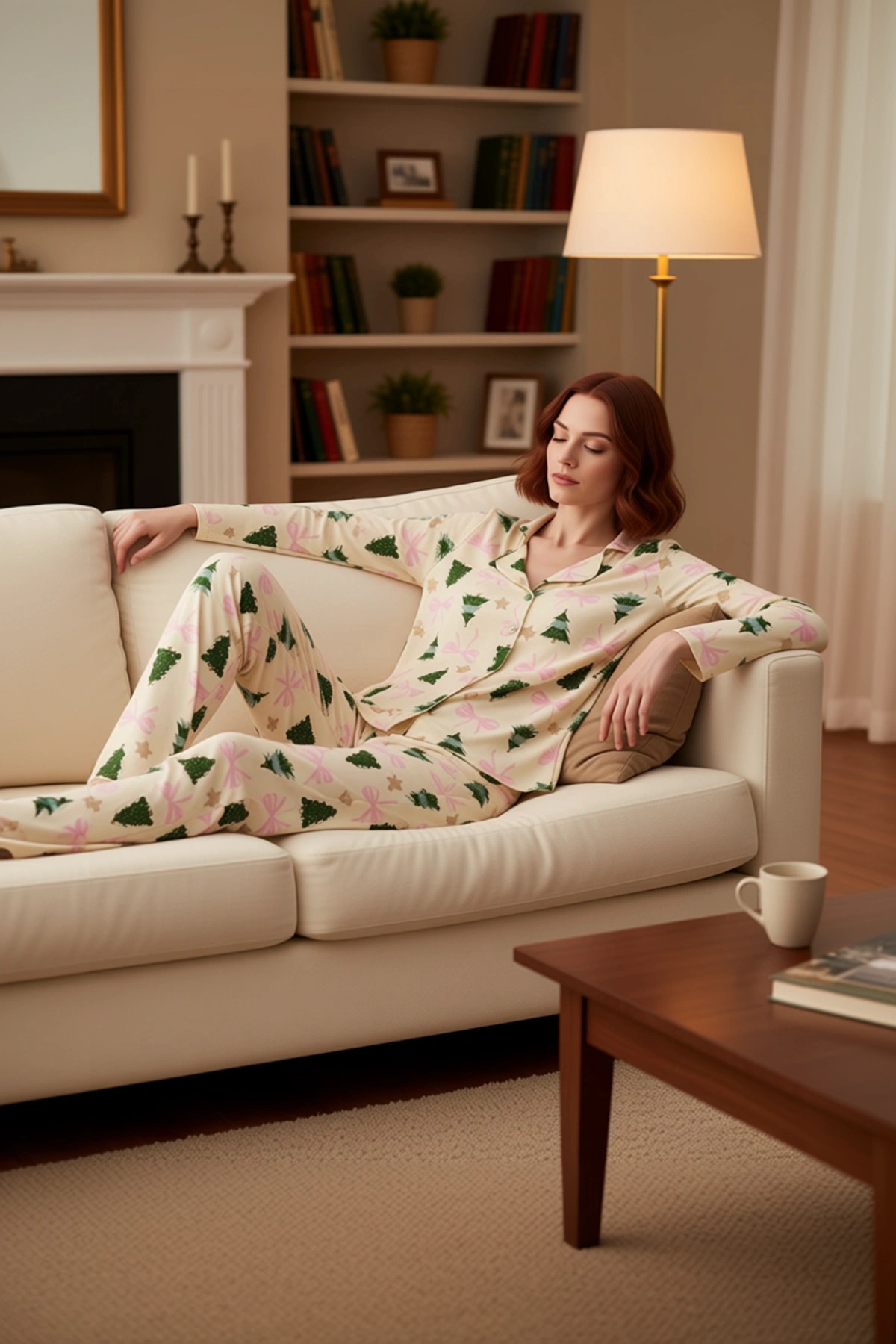 Kadın Yılbaşı Ağaç Baskılı Gömlek ve Pantolon Pijama Takımı Fonksiyonel Dayanıklı Kaliteli