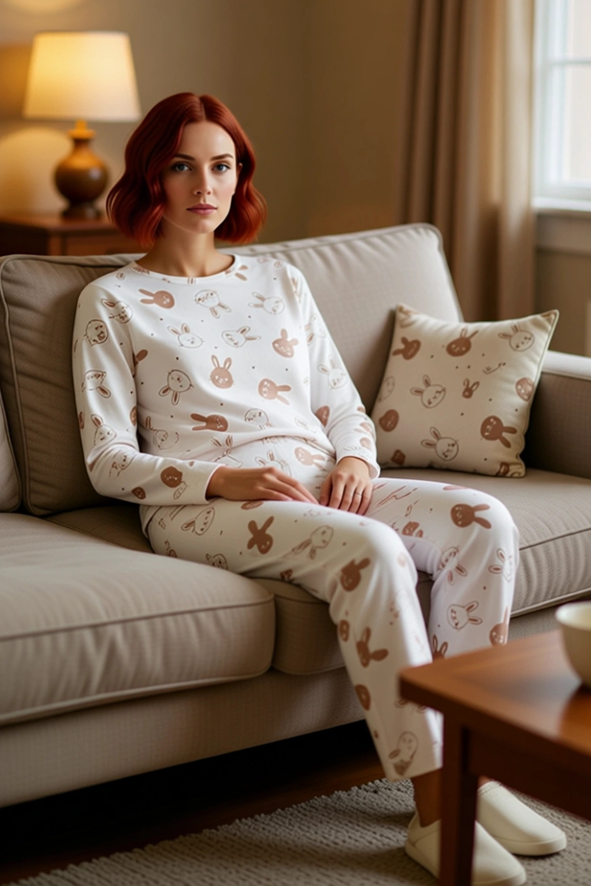 Kadın Tavşan Baskılı Pijama Takımı Bisiklet Yaka Uzun Kollu Fonksiyonel Dayanıklı Kaliteli