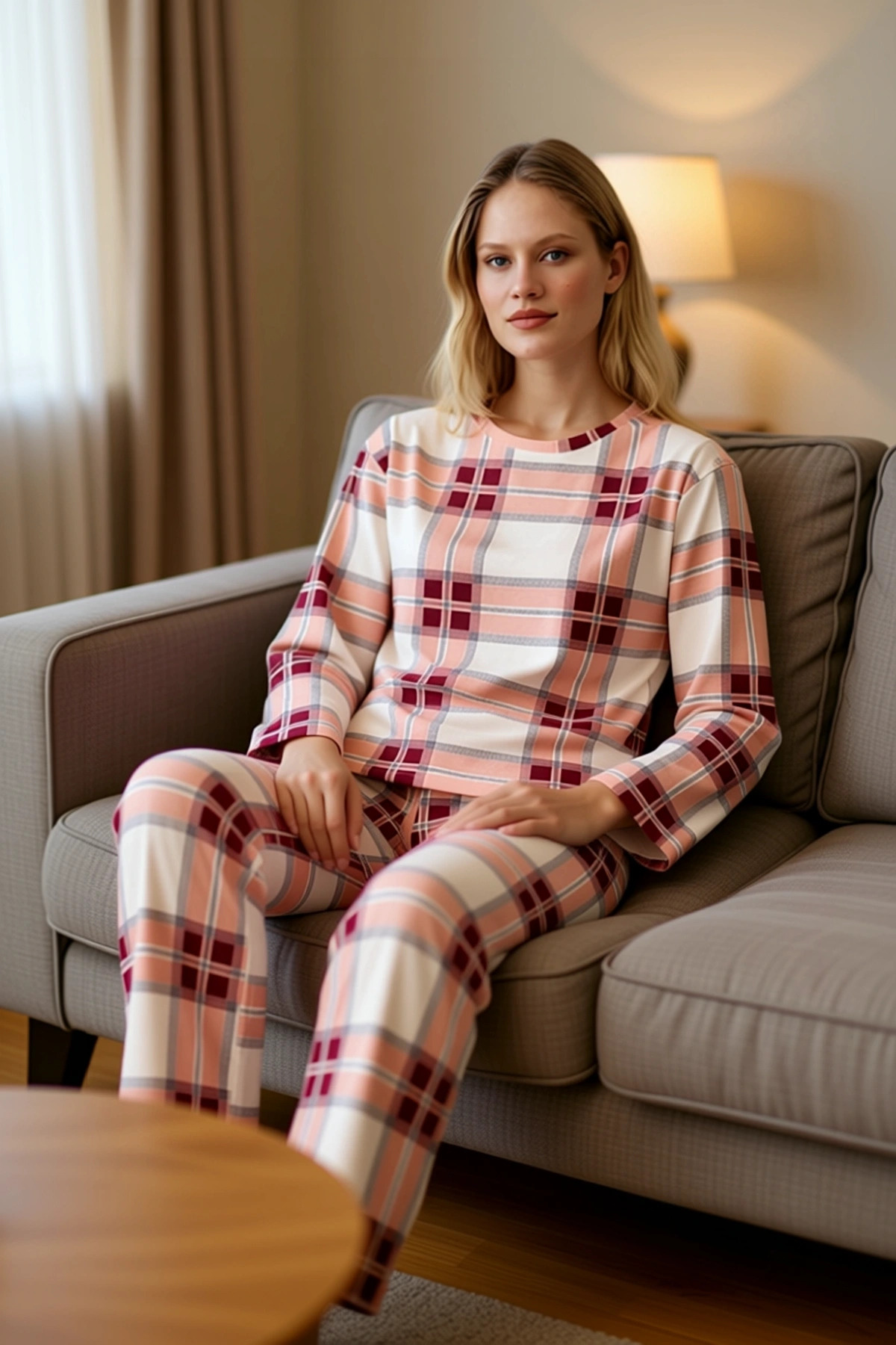 Kadın Ekose Desenli Uzun Kollu Pijama Takımı Fonksiyonel Dayanıklı Kaliteli Konforlu Rahat