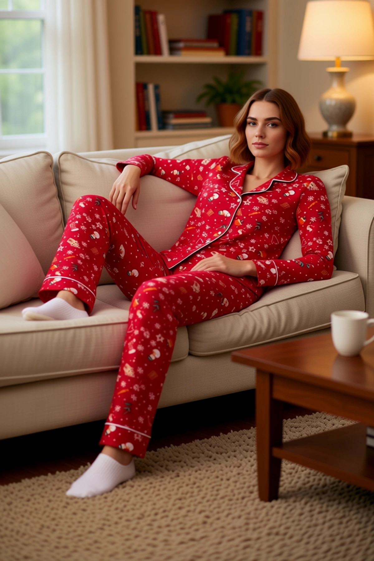 Kadin Kirmizi Yılbaşı Desenli Gömlek Yaka Pijama Seti Fonksiyonel Dayanıklı Kaliteli Rahat