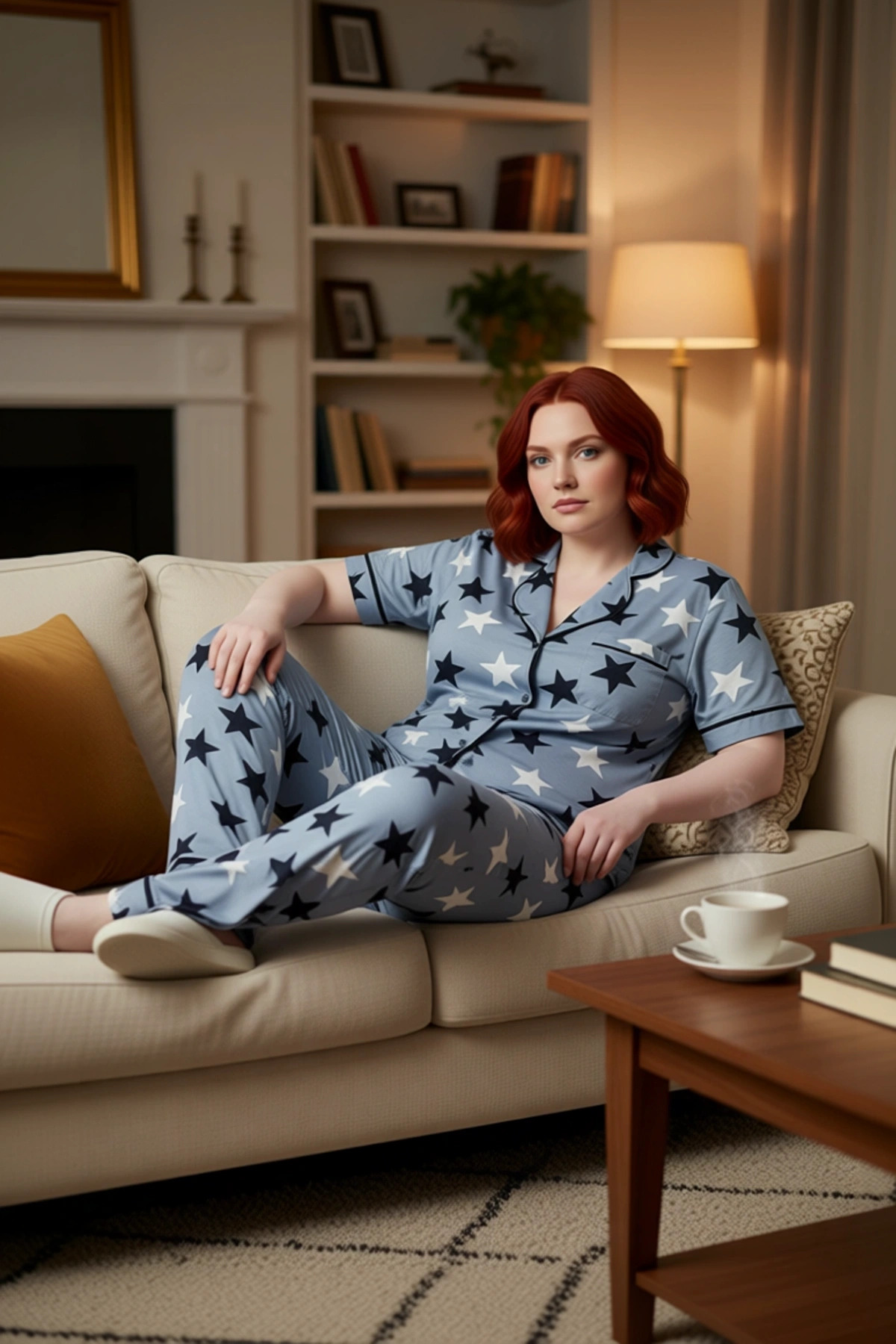 Kadin Yıldız Desenli Pijama Takımı Gömlek Yaka Fonksiyonel Dayanıklı Kaliteli Konforlu Şık