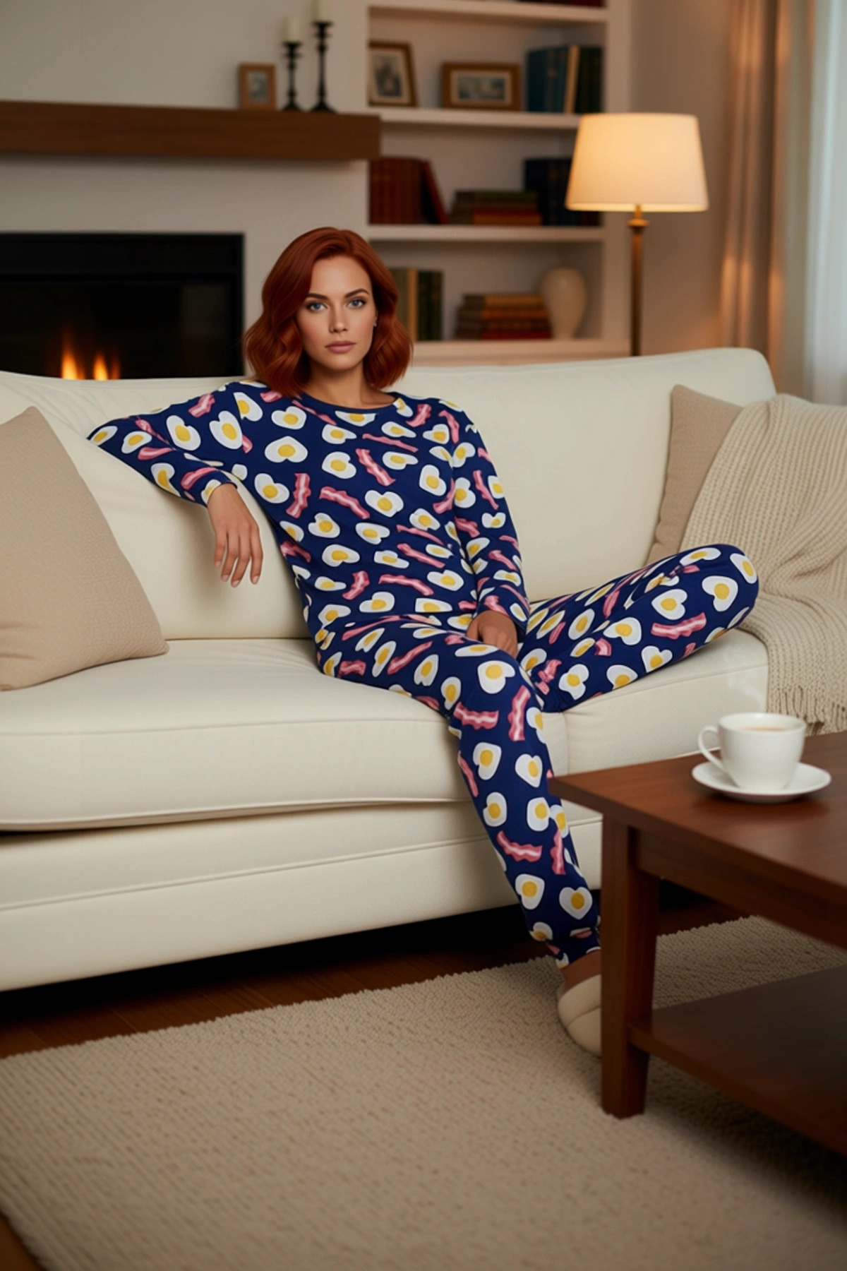 Kadin Bisiklet Yaka Uzun Kollu Pijama Takımı Kahvalti Baskılı Fonksiyonel Dayanıklı Modern