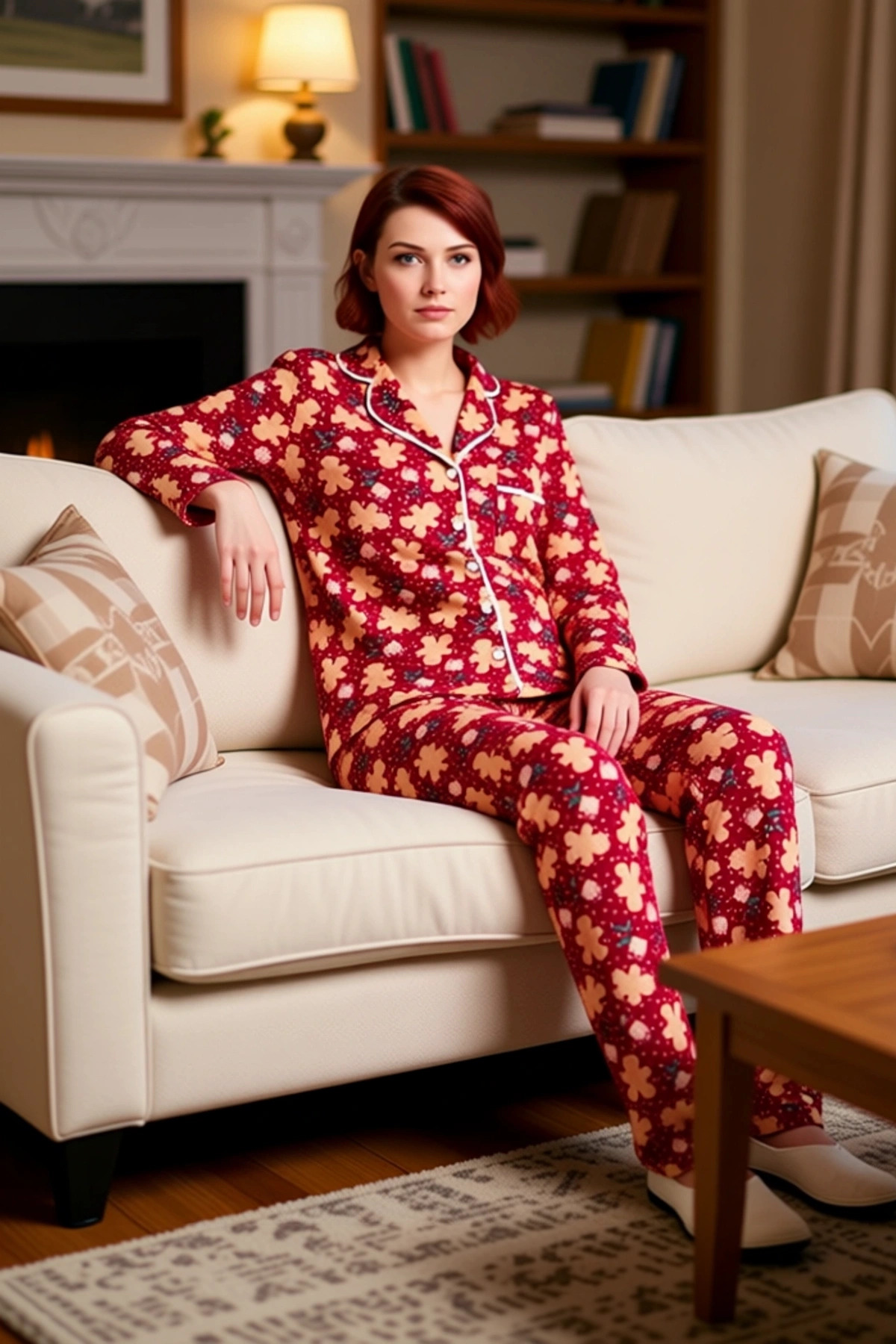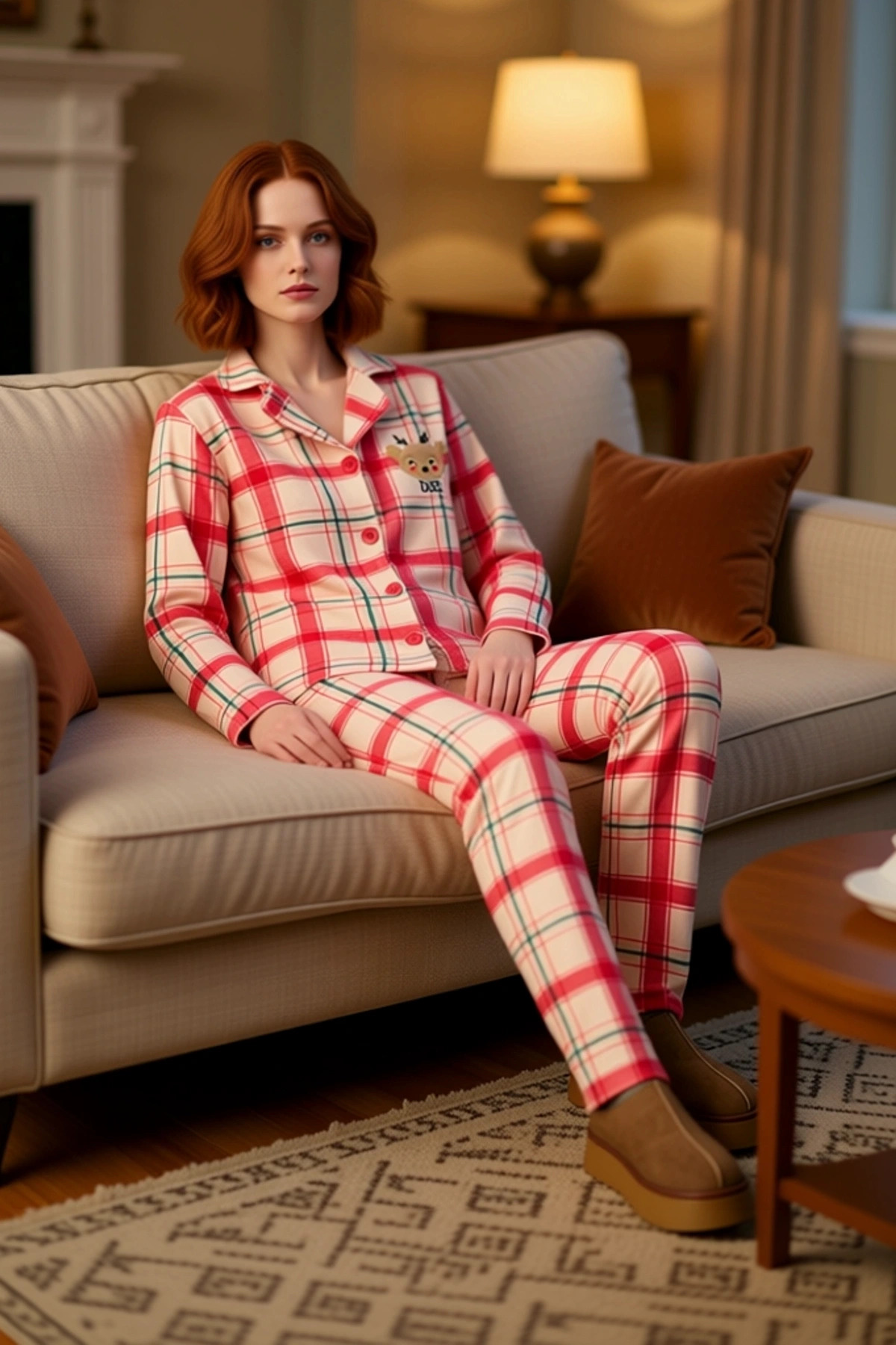 Kadin Kirmizi Kurabiye Adam Desenli Pijama Takımı Fonksiyonel Dayanıklı Kaliteli Konforlu Şık