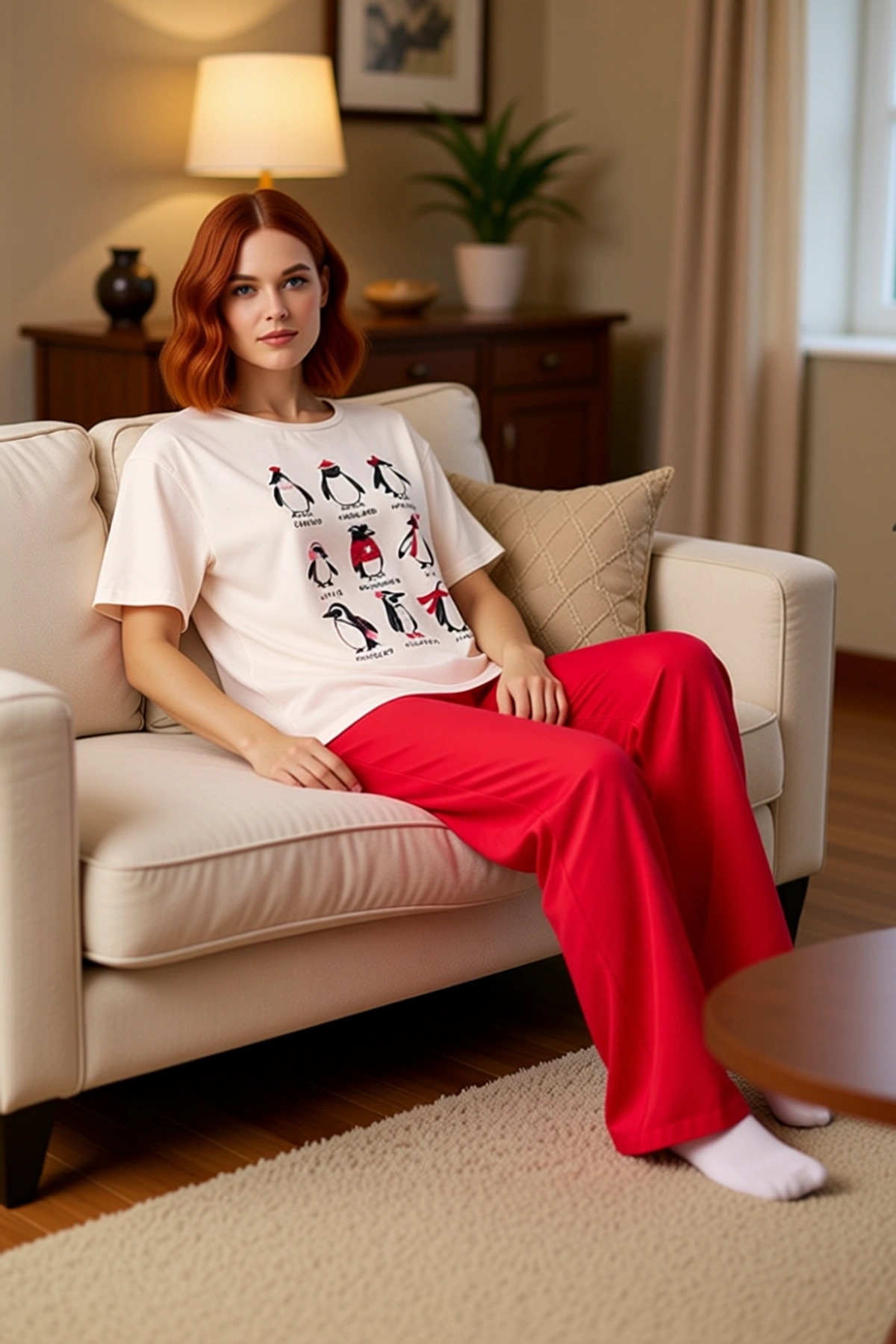 Kadın Penguen Baskılı Bisiklet Yaka Pijama Takımı Fonksiyonel Dayanıklı Kaliteli Konforlu Şık