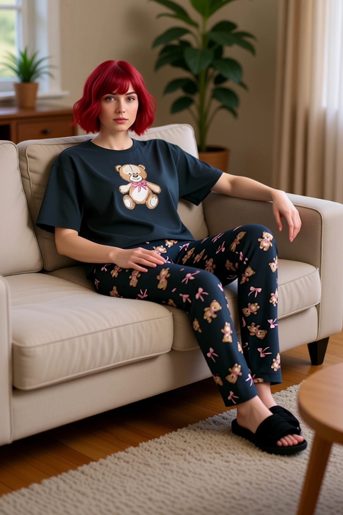Kadin Ayiciikli Kalpli Pijama Takımı Gömlek Yaka Düğmeli Fonksiyonel Dayanıklı Kaliteli Şık