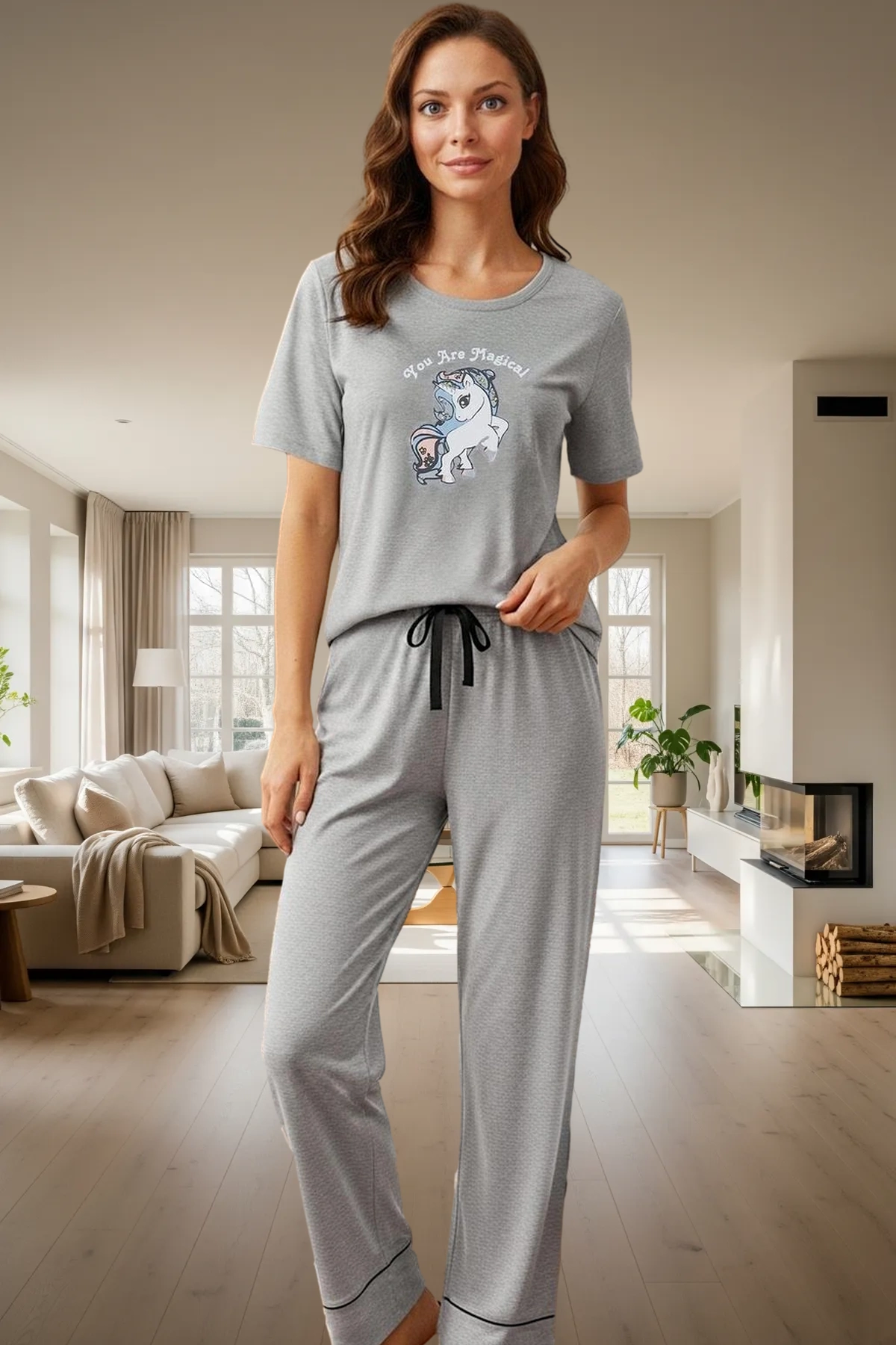 Kadın Ev Giyim Unicorn Baskılı Pijama Seti Fonksiyonel Dayanıklı Kaliteli Konforlu Estetik