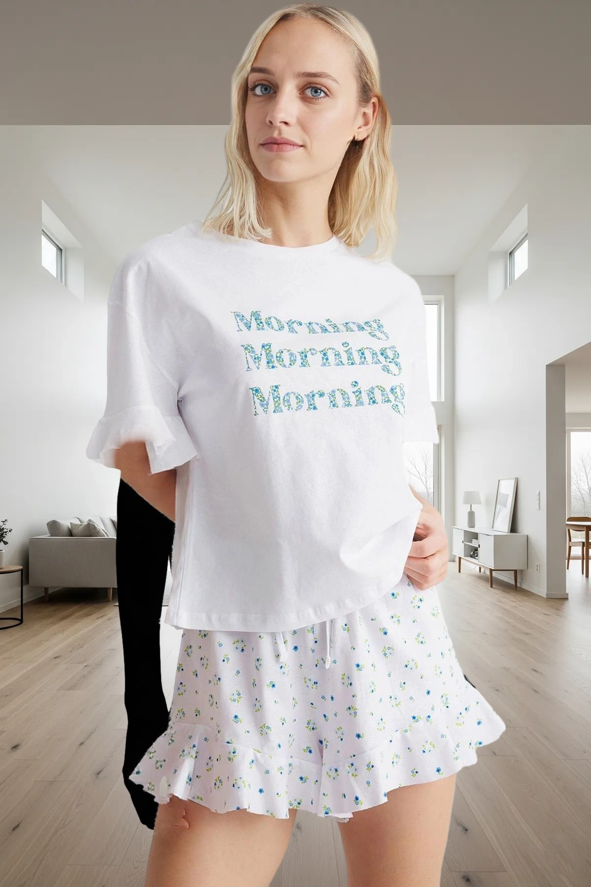 Pamuklu Rahat Pijama Takımı Çiçekli Desenli Volanlı Şort ve Bisiklet Yaka Tişört Dayanıklı Malzeme