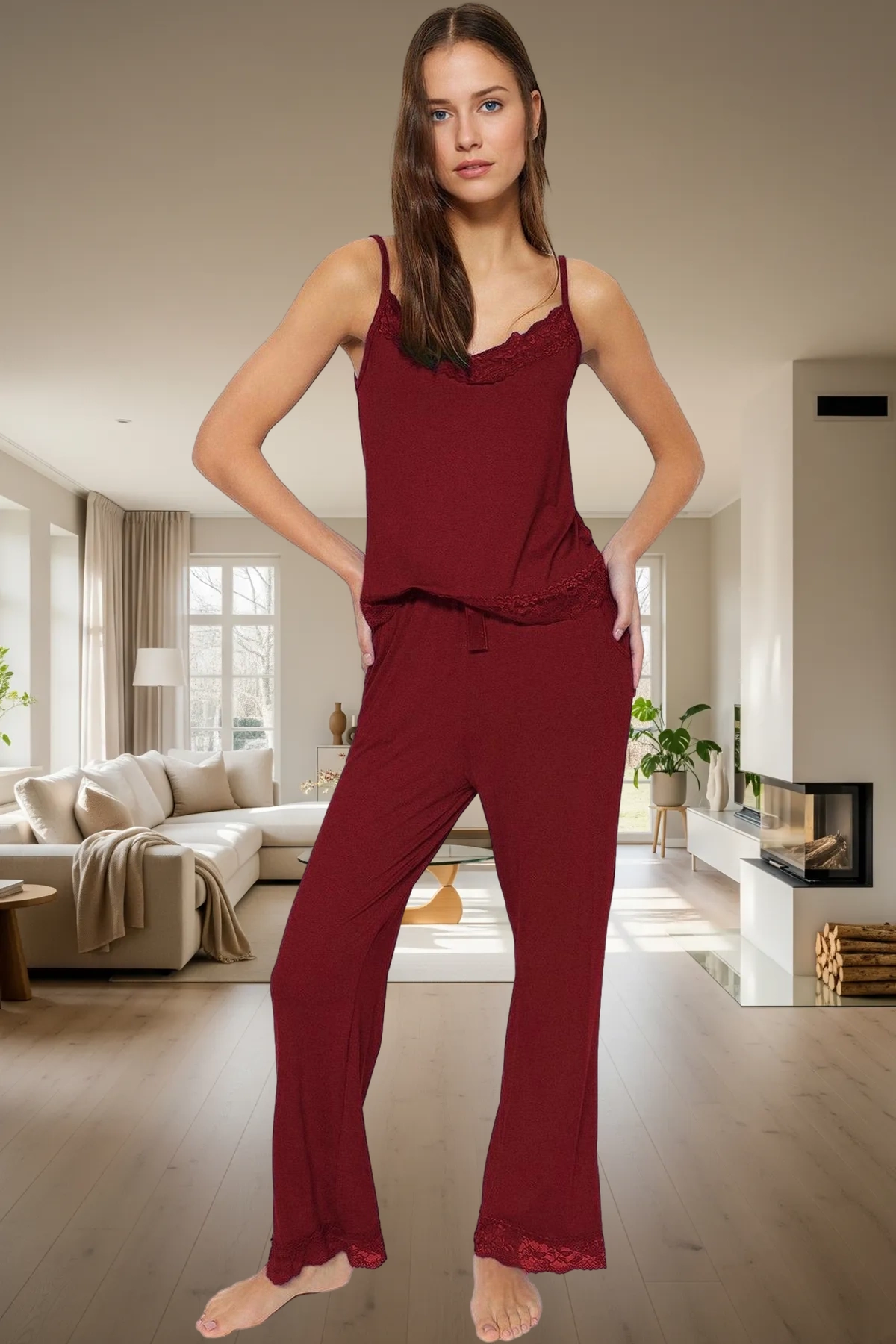 Kadın Viskon Dantel Detaylı Lounge Pijama Takımı Fonksiyonel Dayanıklı Kaliteli Konforlu Şık