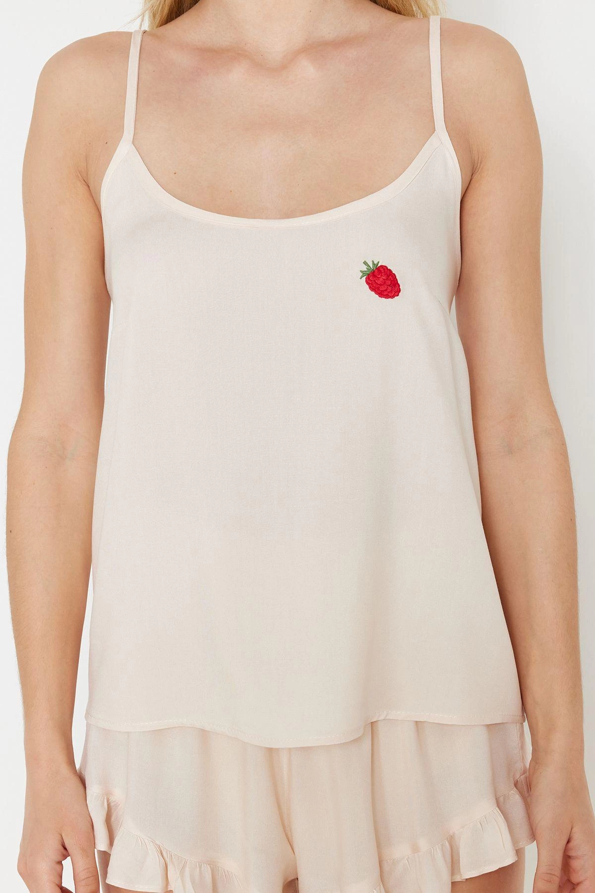 Tarz Rahat Kolsuz Kol Geniş Paça Avokado Nakışlı Fırfırlı İp Viskon Dokuma Pijama Takımı